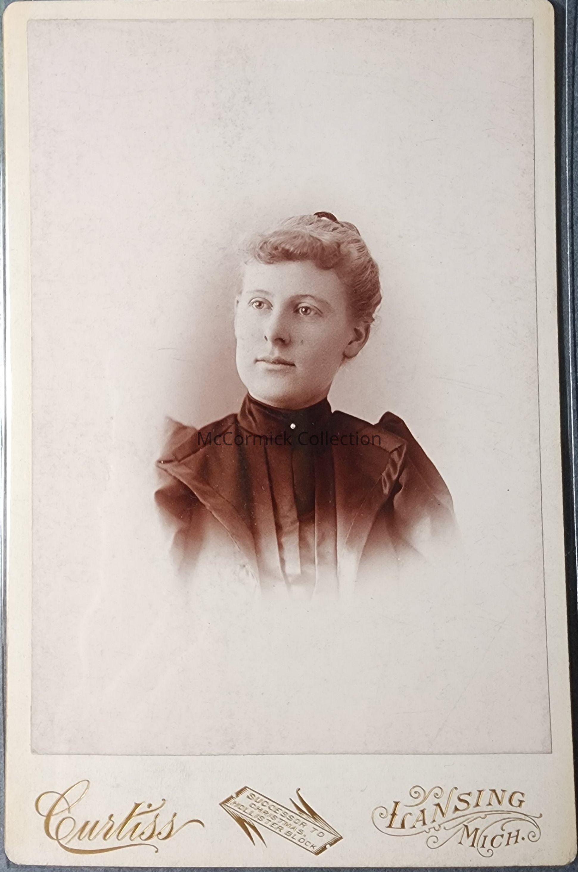 Cabinet card photograph of "Aunt Nellie Willis" by Lansing photographer Curtiss, circa 1890s.