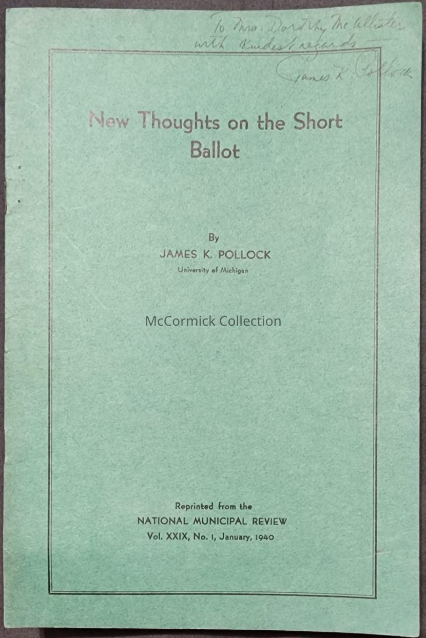 A 1940 publication by James K. Pollock on Short Ballots. Pollock was a delegate from Washtenaw County to Michigan's 1961-62 Constitutional Convention (Con Con).