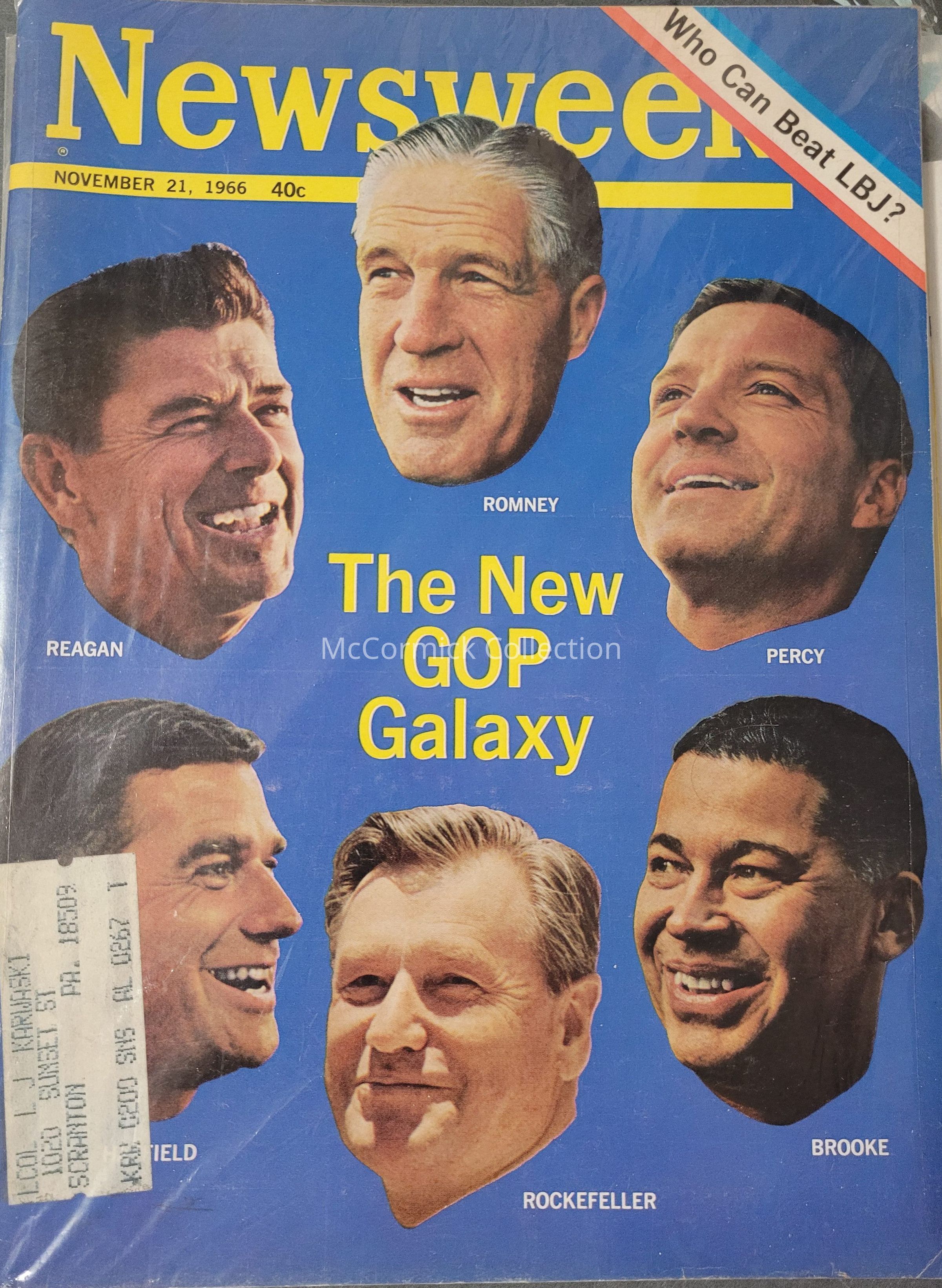 November 21, 1966 issue of Newsweek featuring "The New GOP Galaxy" and slogan "Who Can Beat LBJ?" with George Romney floating head on the cover.