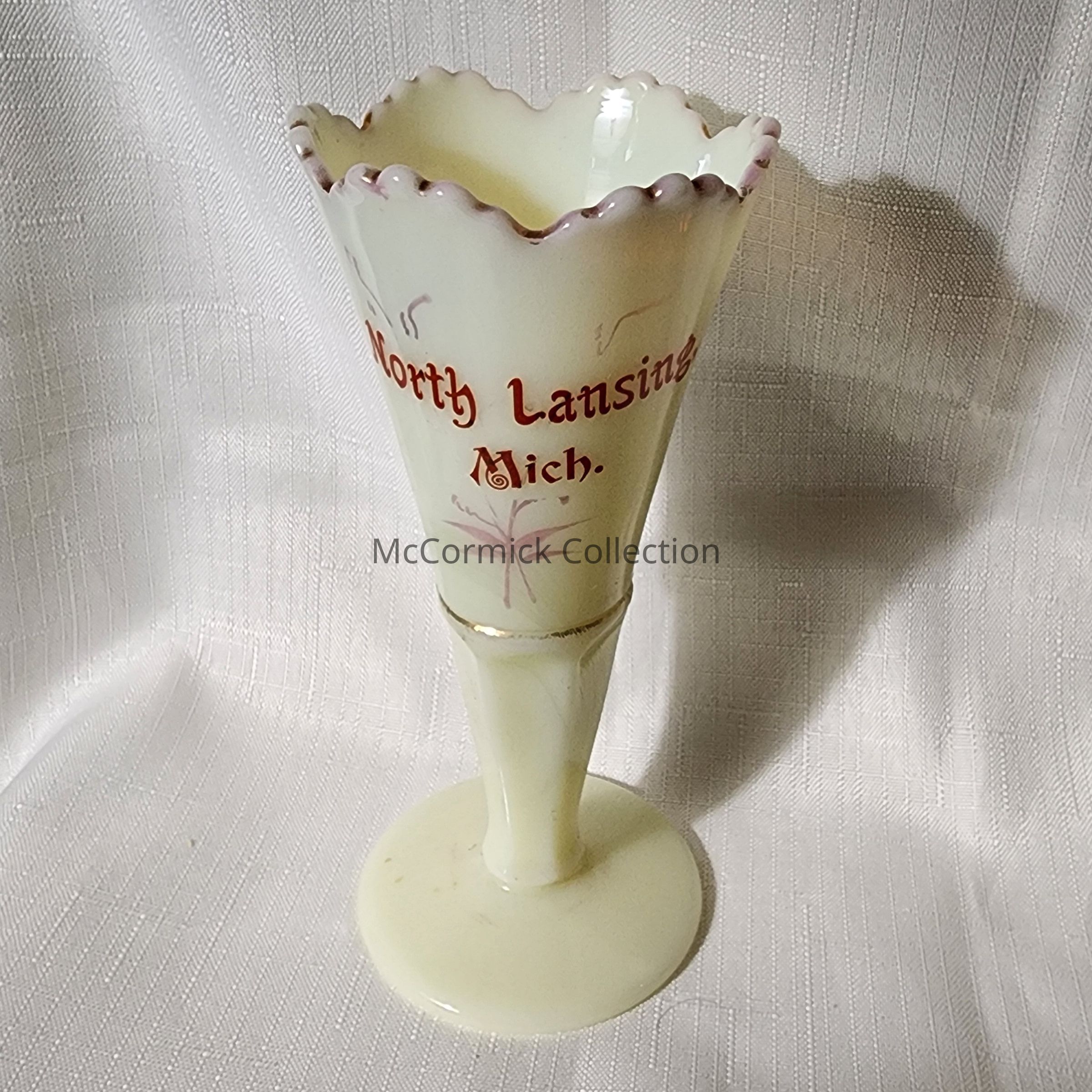 Custard glass souvenir vase or glass/cup from North Lansing, Michigan.