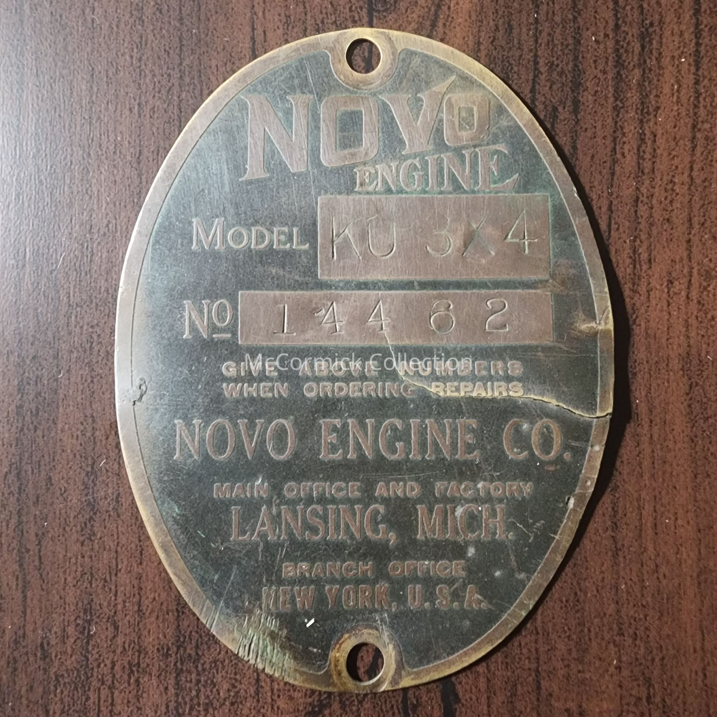An oval metal plate badge from a Novo Engine Co. product, made in Lansing, Michigan. Model KU3x4, No. 14462.