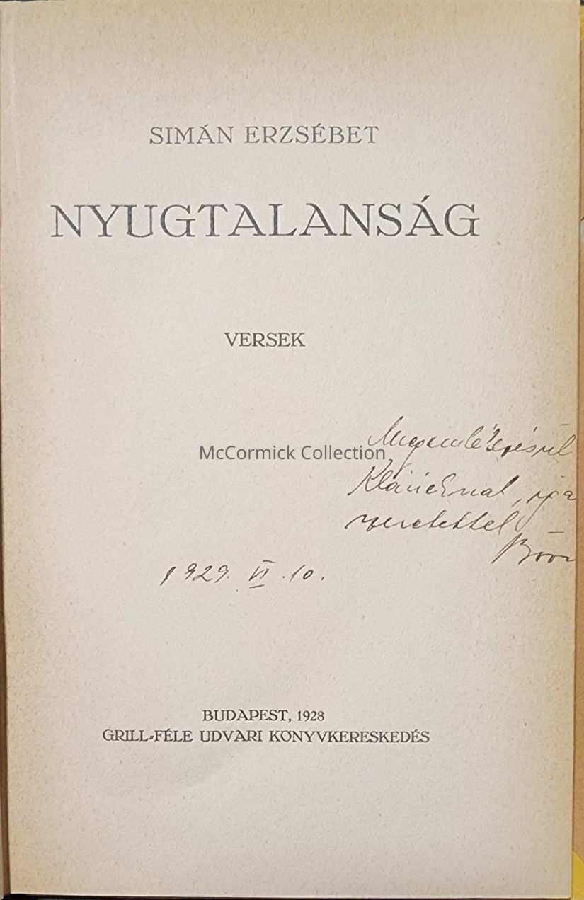 "Nyugtalansag," by Siman Erzsebet, published by Hungaria Hirlapnyomda in Budapest, Hungary, circa 1929.