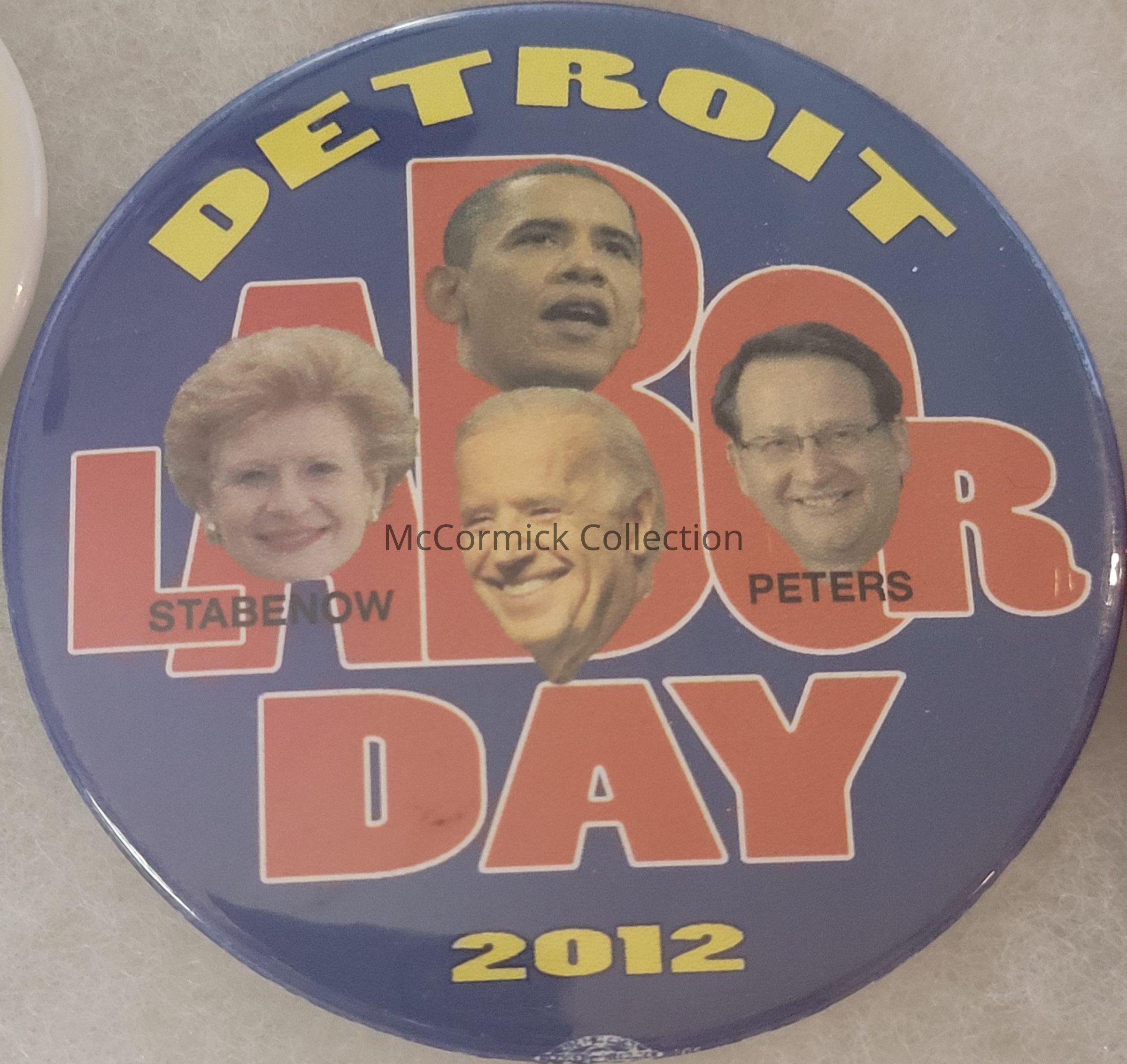 A 3" coattail political button from Detroit Labor Day 2012 for Barack Obama for President, Joe Biden for Vice President, Debbie Stabenow of U.S. Senate, and Gary Peters for U.S. Congress.