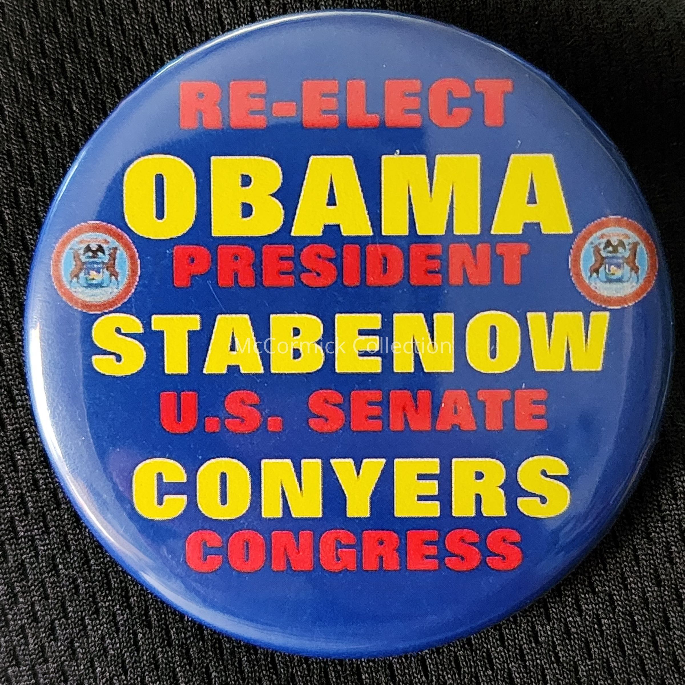 A 2.25" red, yellow, and blue coattail button for Barack Obama for President, Debbie Stabenow for U.S. Senate, and John Conyers for Congress, circa 2012.