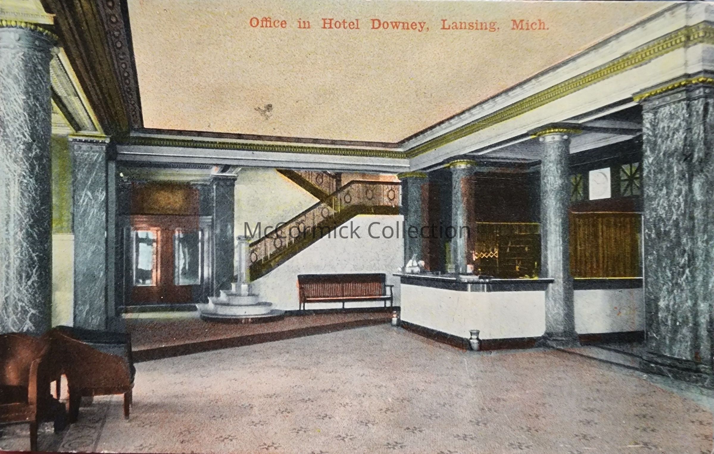 Postcard of the office and lobby of the Downey House hotel in Lansing, Michigan. Postally used, postmarked Lansing 1911.
