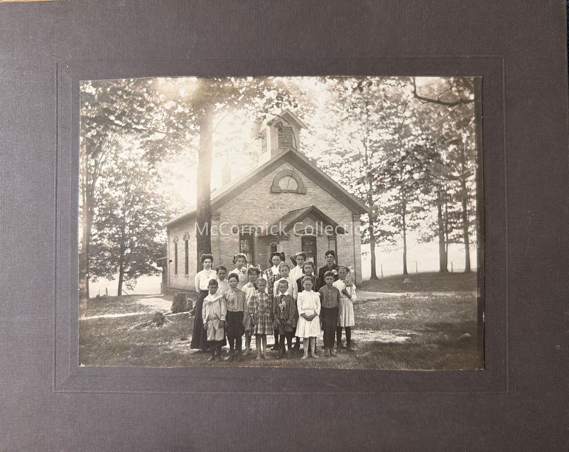 Card mounted photograph of a one room school. Possibly the Community School, fractional between Lansing and DeWitt or a southern Clinton County school. Unidentified.