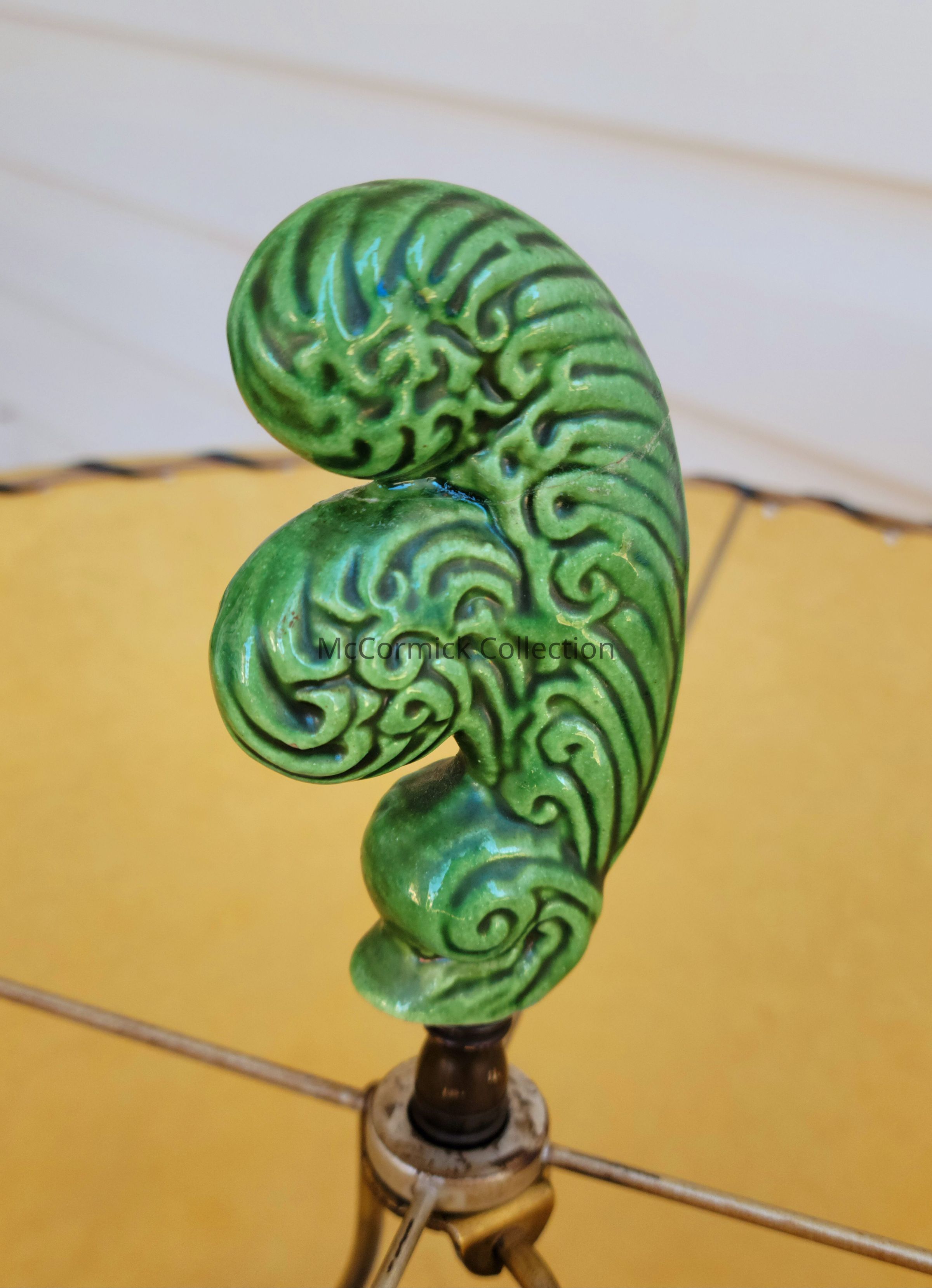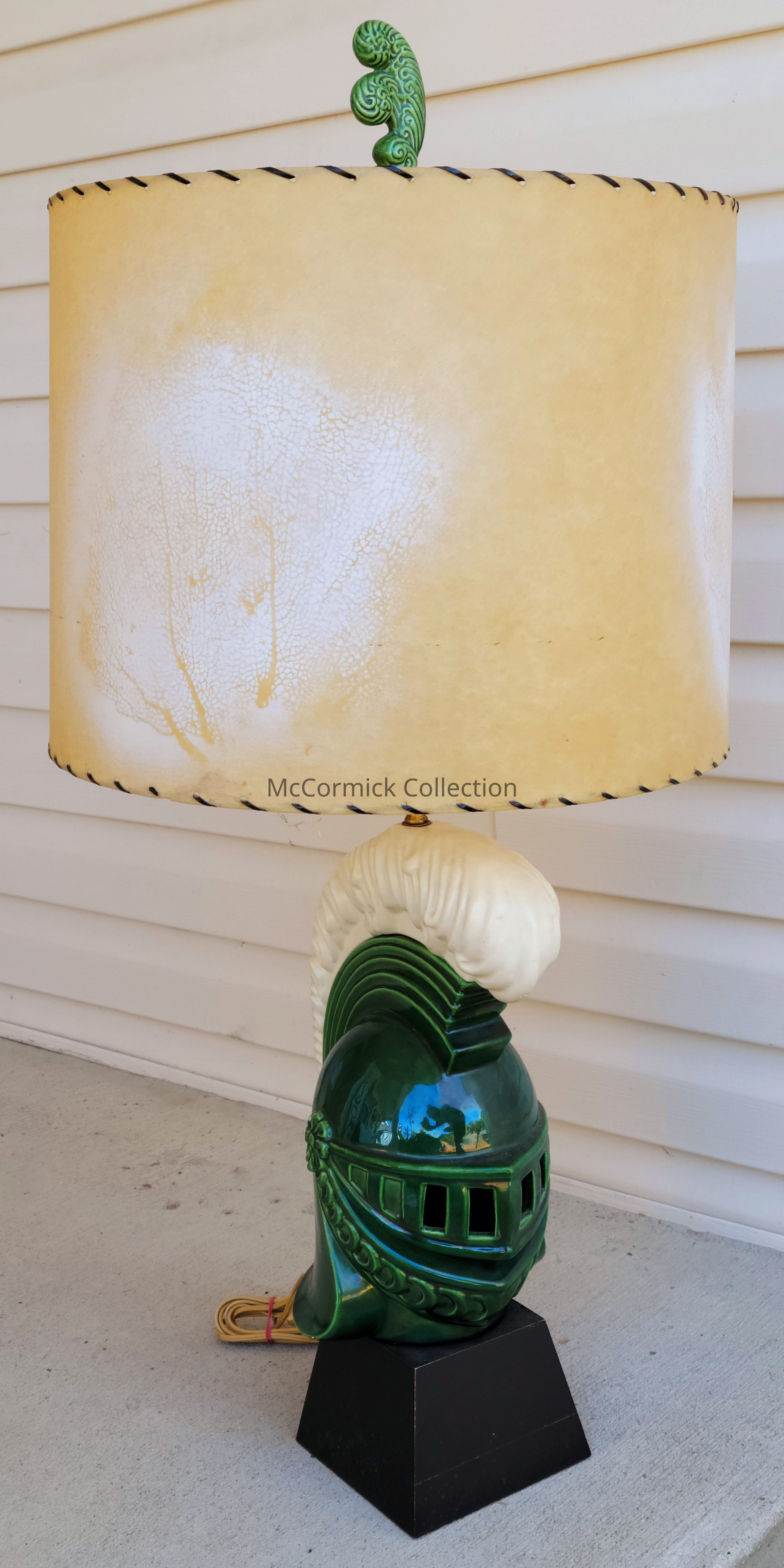 A pair of green and white ceramic lamps in the shape of a Spartan helmet. Unknown if mass produced or home made ceramics. Circa 1960s-70s. Have matching finials and fiberglas drum lampshades.