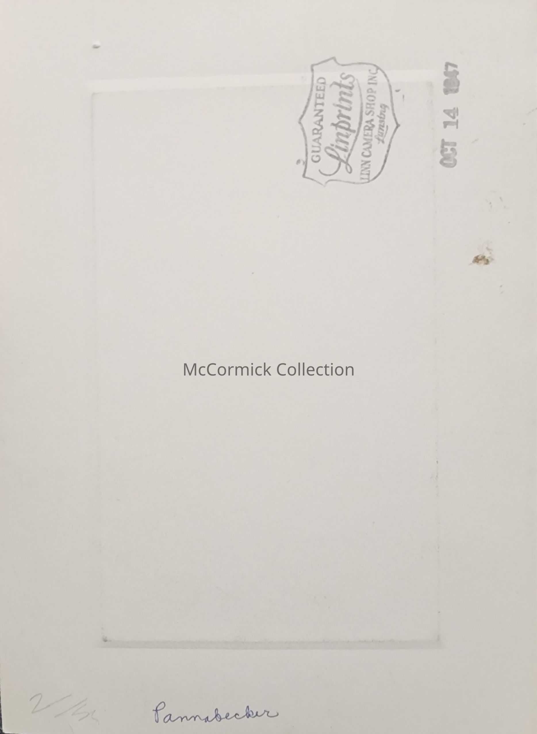 Photographic print of a man identified as Pannabecker, printed by Lansing shop Linprints, October 14, 1947.