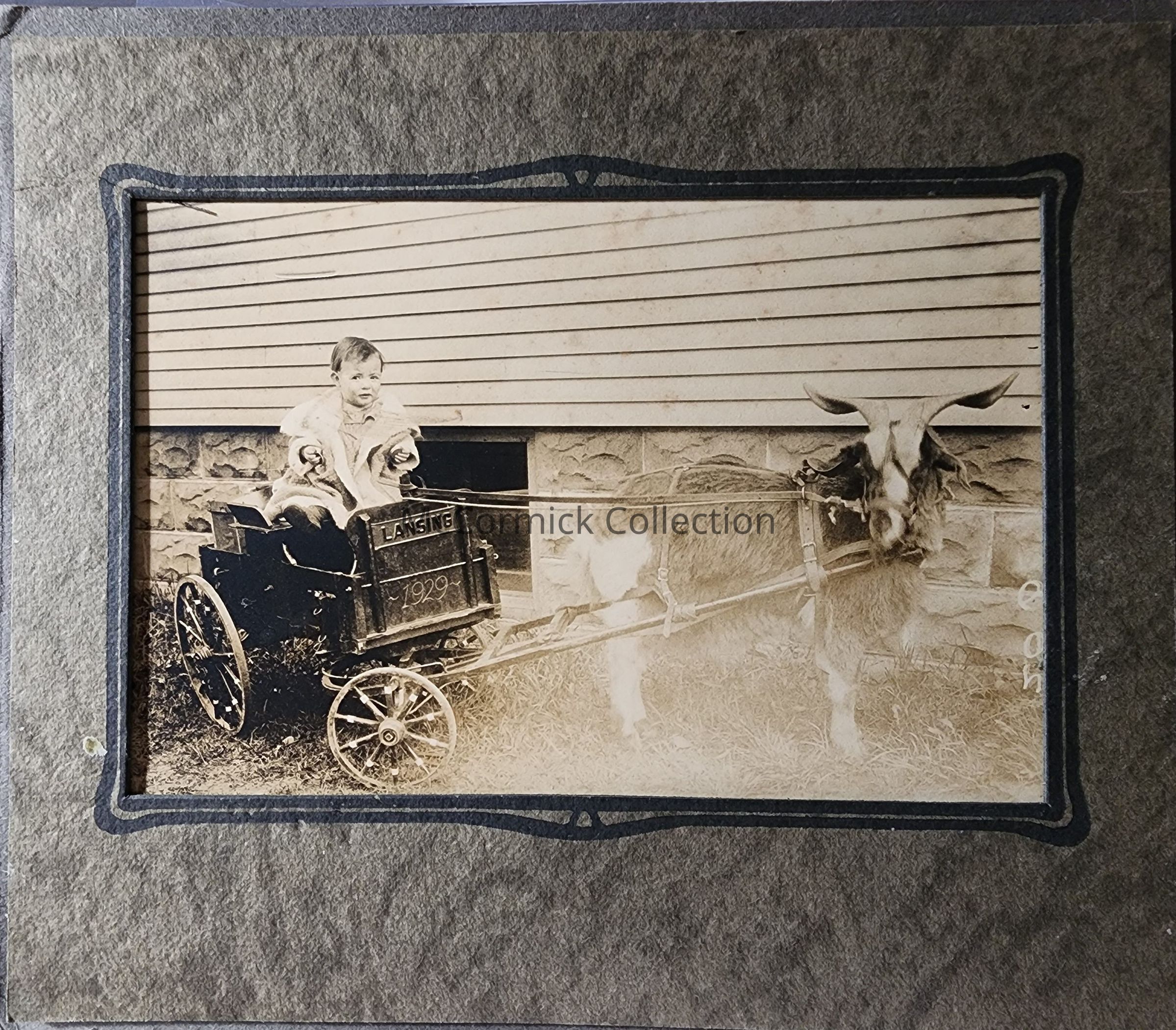 Photograph of Patricia Fosnight (sic) riding a traveling goat cart reading: Lansing 1929.