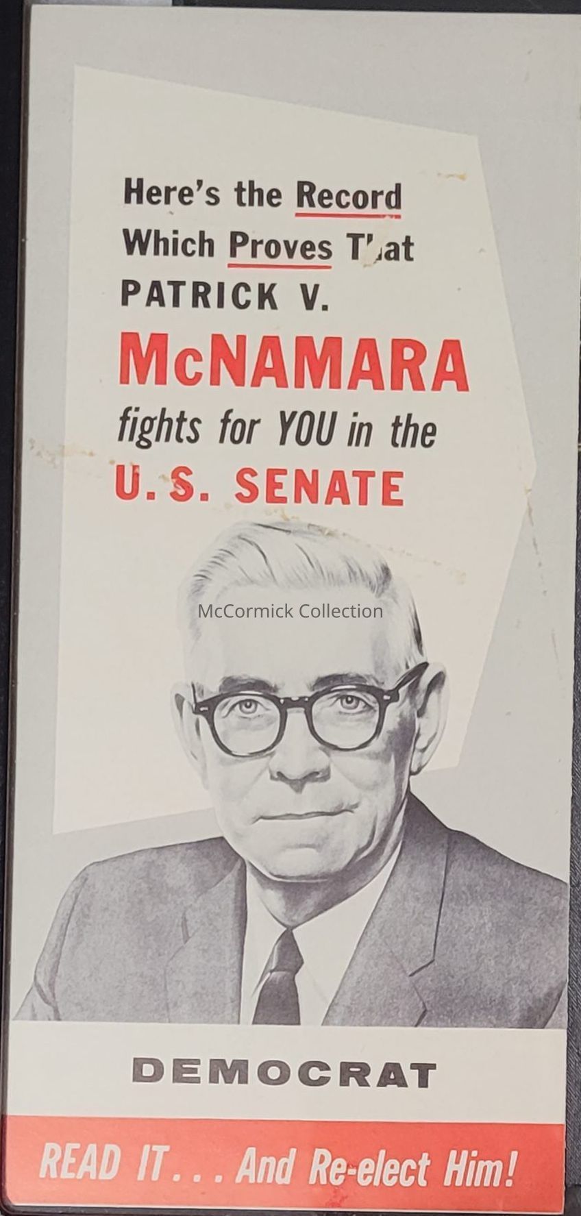 A Pamphlet for Patrick V. McNamara for U.S. Senate. Reads: "Here's the Record Which Proves that Patrick V. McNamara fights for you in the U.S. Senate / Democrat / Read it... and Re-elect him!"