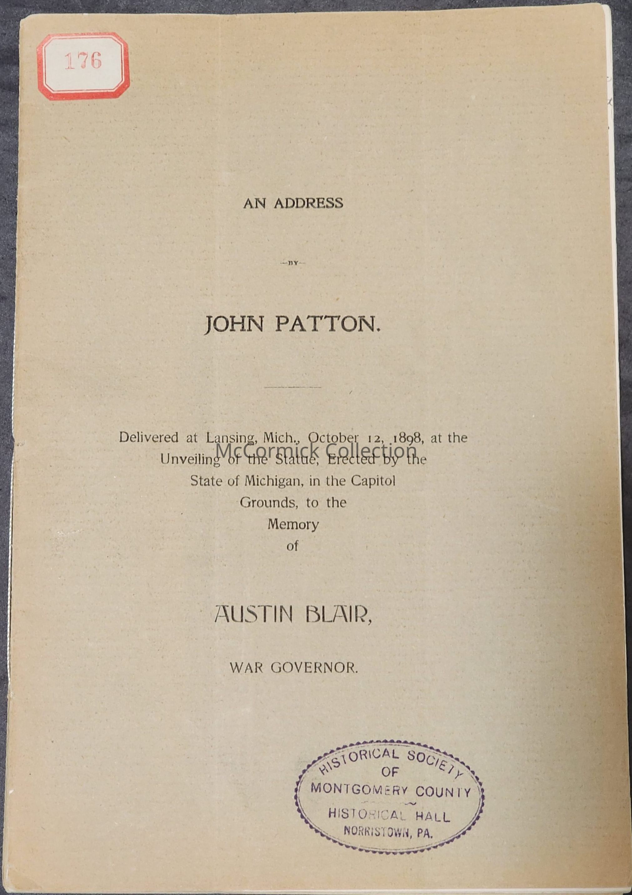 Booklet: An Address by John Patton / Delivered at Lansing, Mich., October 12, 1898, at the Unveiling of the Statue, Erected by the State of Michigan, in the Capitol Grounds to the Memory of / Austin Blair, War Governor.