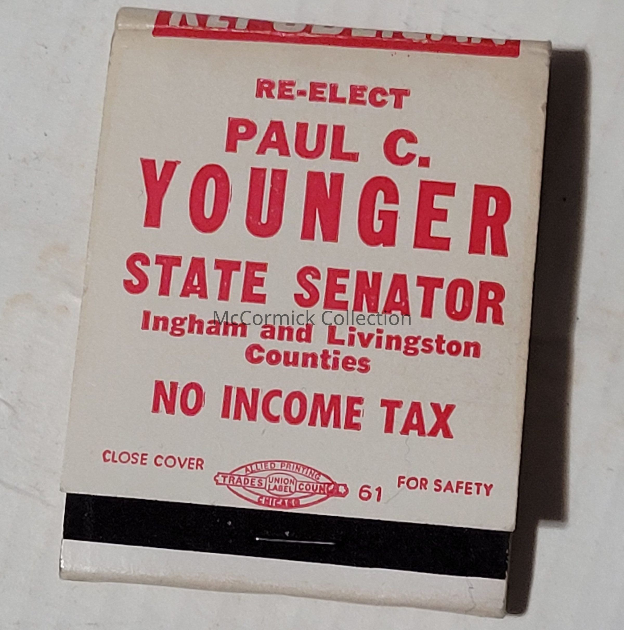 A political matchbook cover for Paul C. Younger for State Senator of Ingham and Livingston Counties, circa 1960s. No Income Tax slogan.