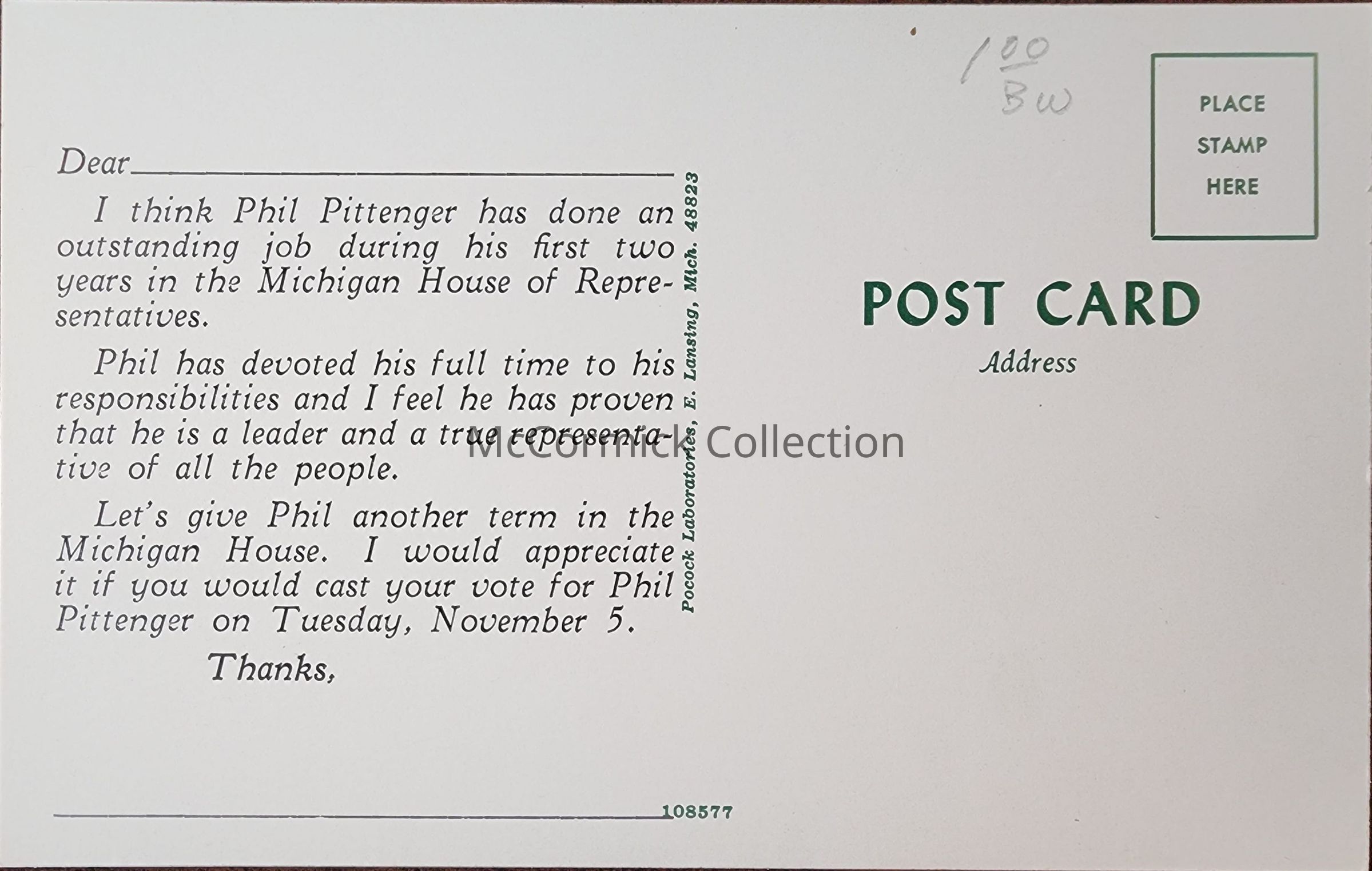 Phil O. Pittenger State Representative Postcard