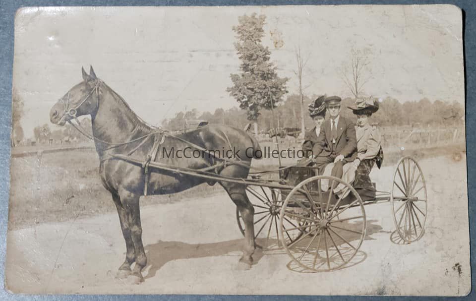 Real Photo Postcard of a family in a horse drawn carriage, dated 1908.