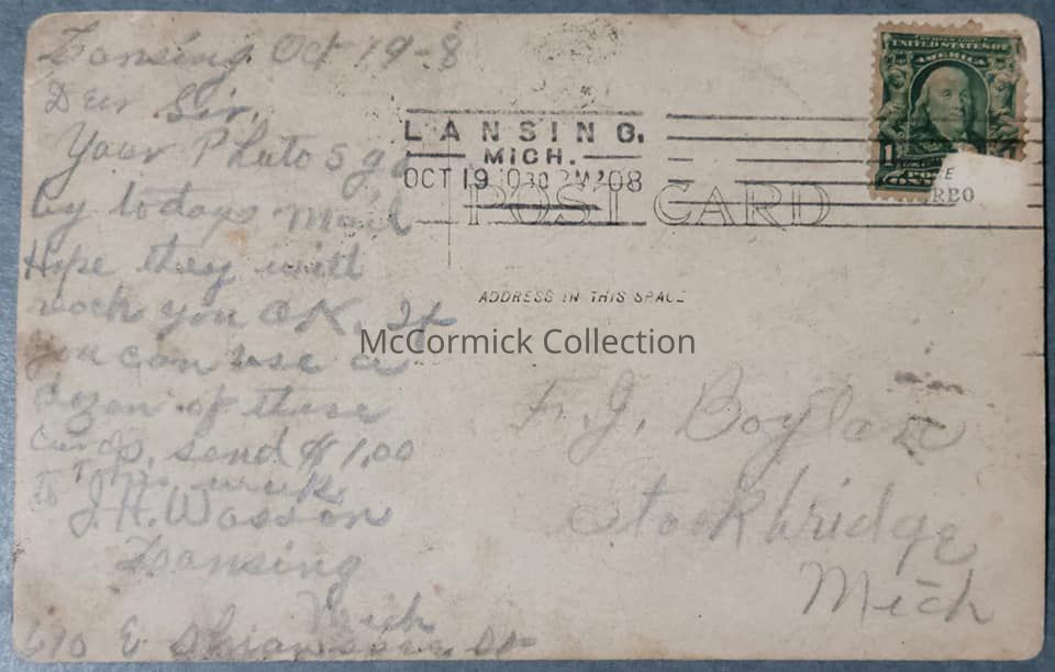 "Lansing, Oct 19-8. Dear Sir, Your photos go by todays mail. Hope they reach you OK. If you can use a dozen of these cards, send $1.00 this week to J.H. Wasson, Lansing, Mich, 610 E. Shiawassee St."