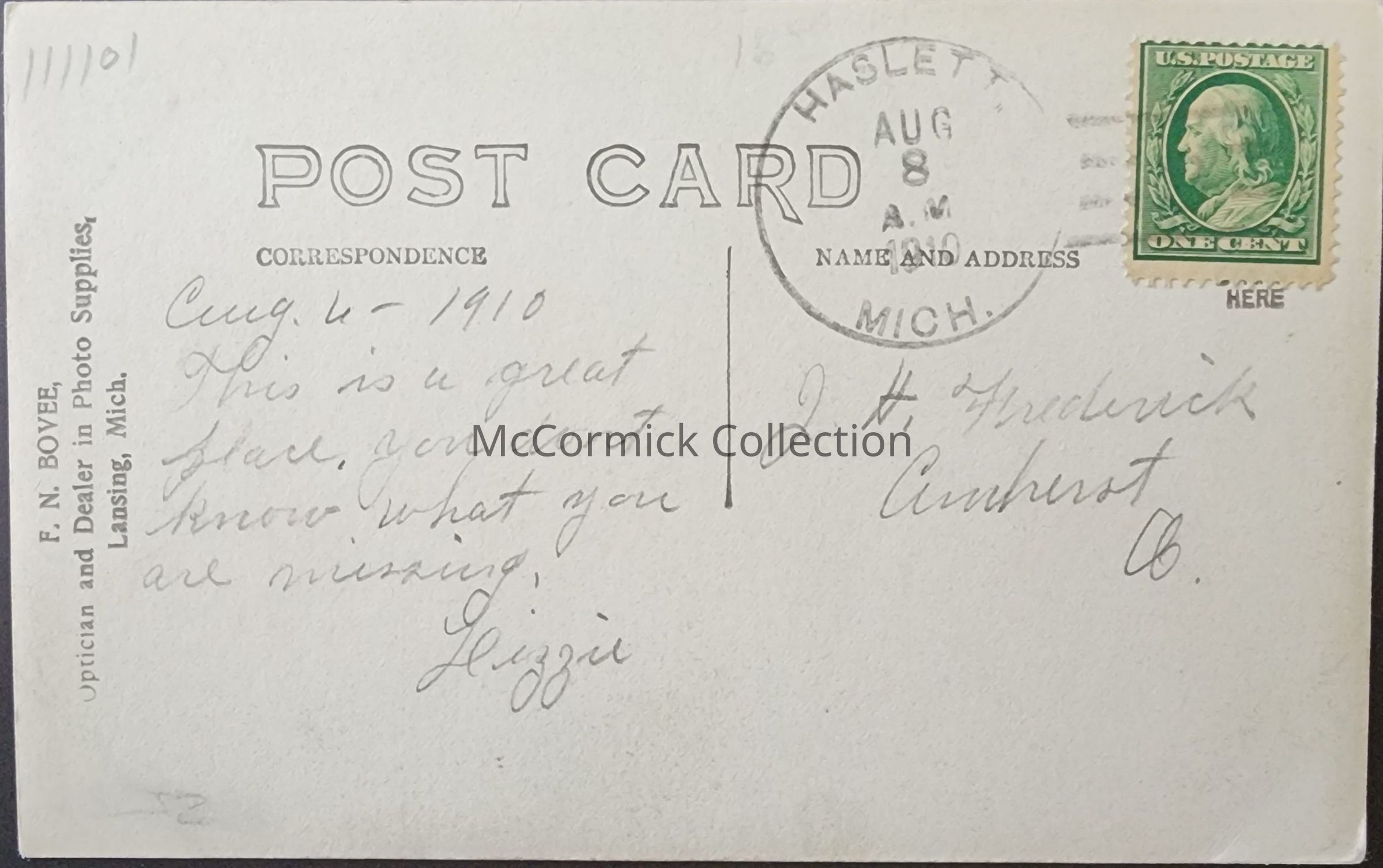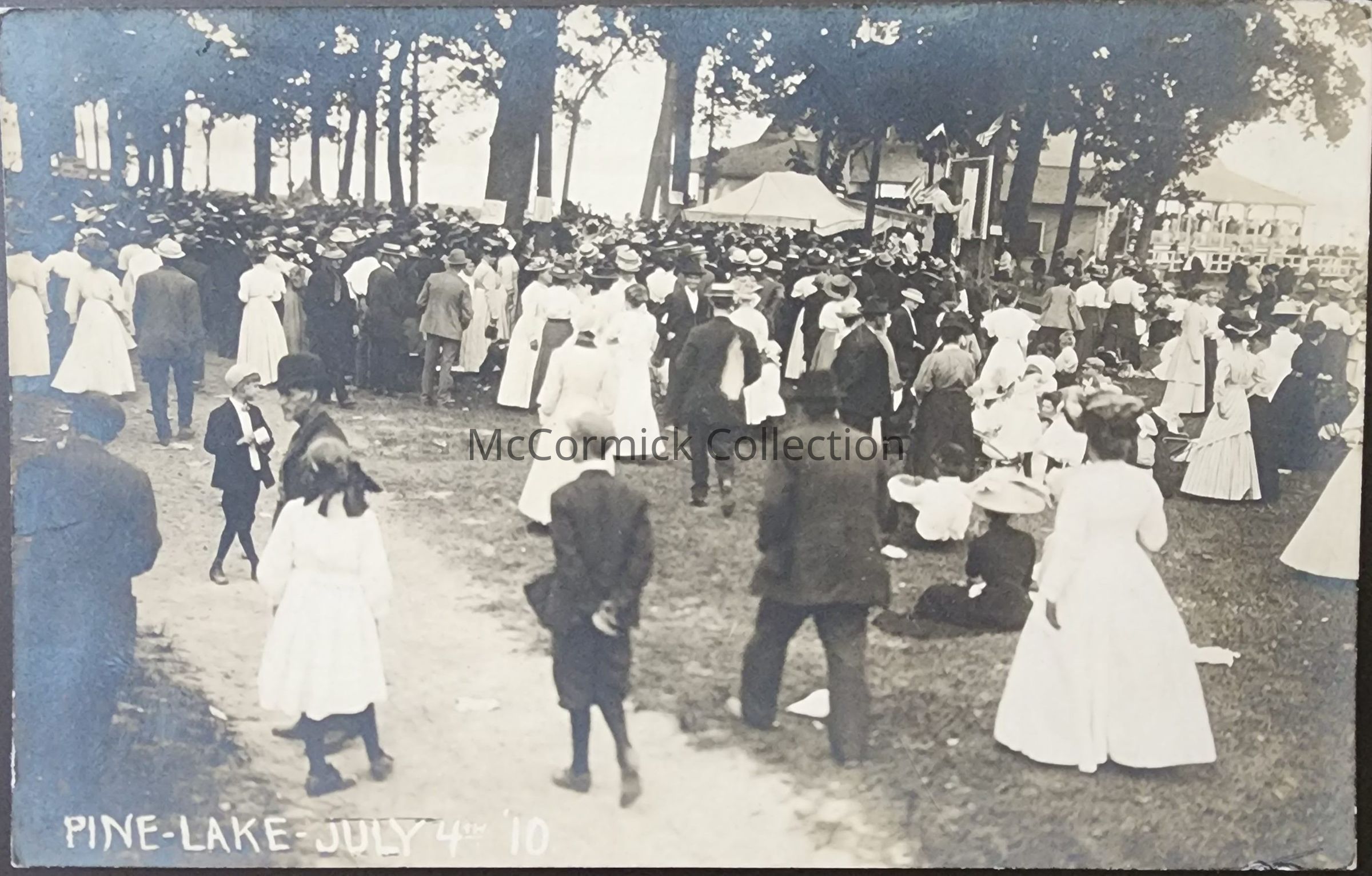 Real photo postcard of Pine Lake on July 4th, 1910. Postally used, 1910 Haslett postmark. Photo by Lansing photographer Bovee.