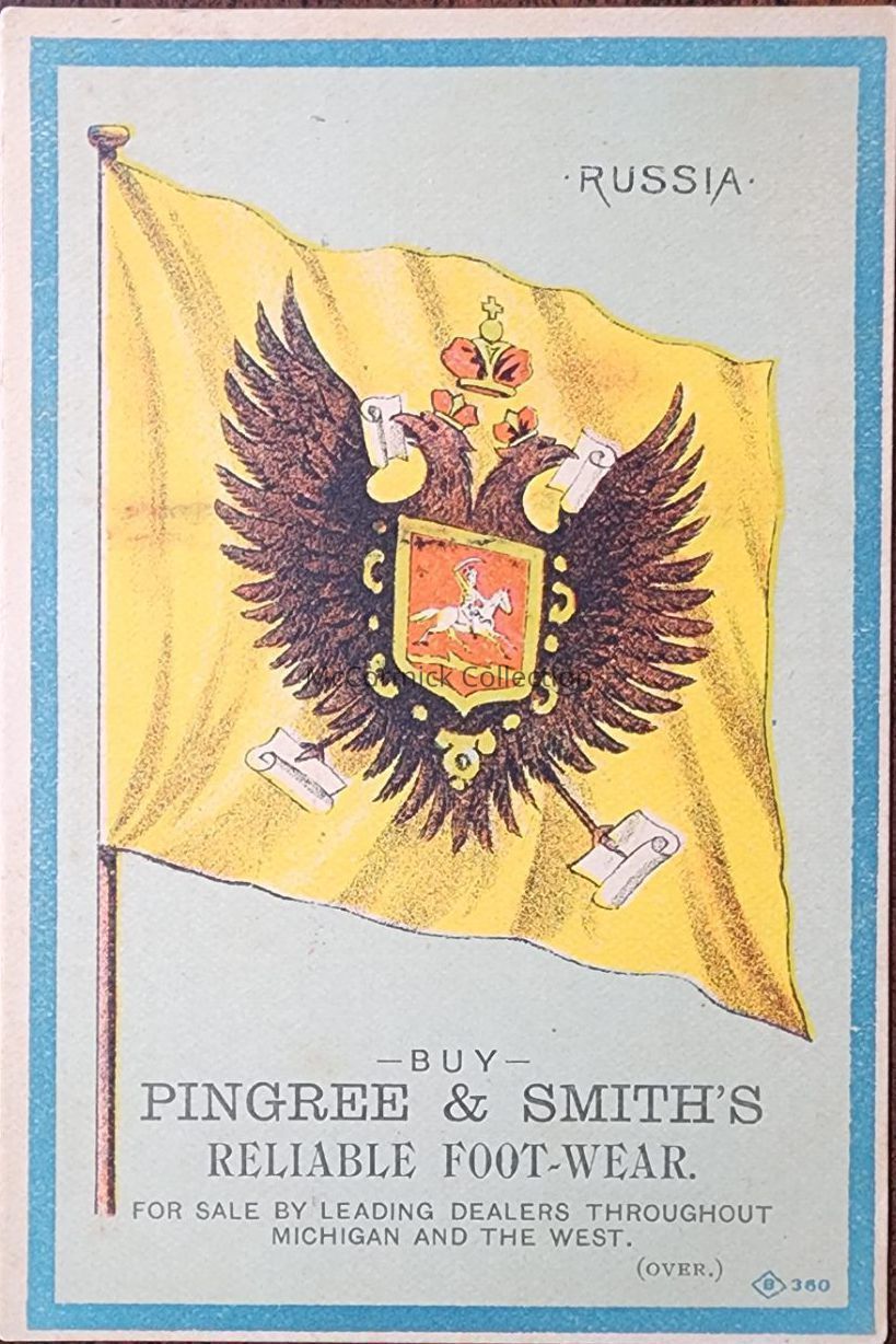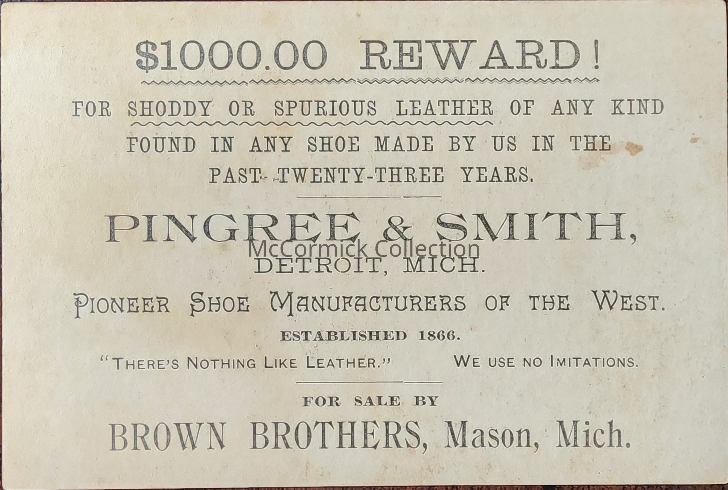 Pingree and Smith shoe manufacturers of Detroit trade card for dealers Brown Brothers of Mason, Michigan. Hazen Pingree was Detroit Mayor Michigan Governor.
