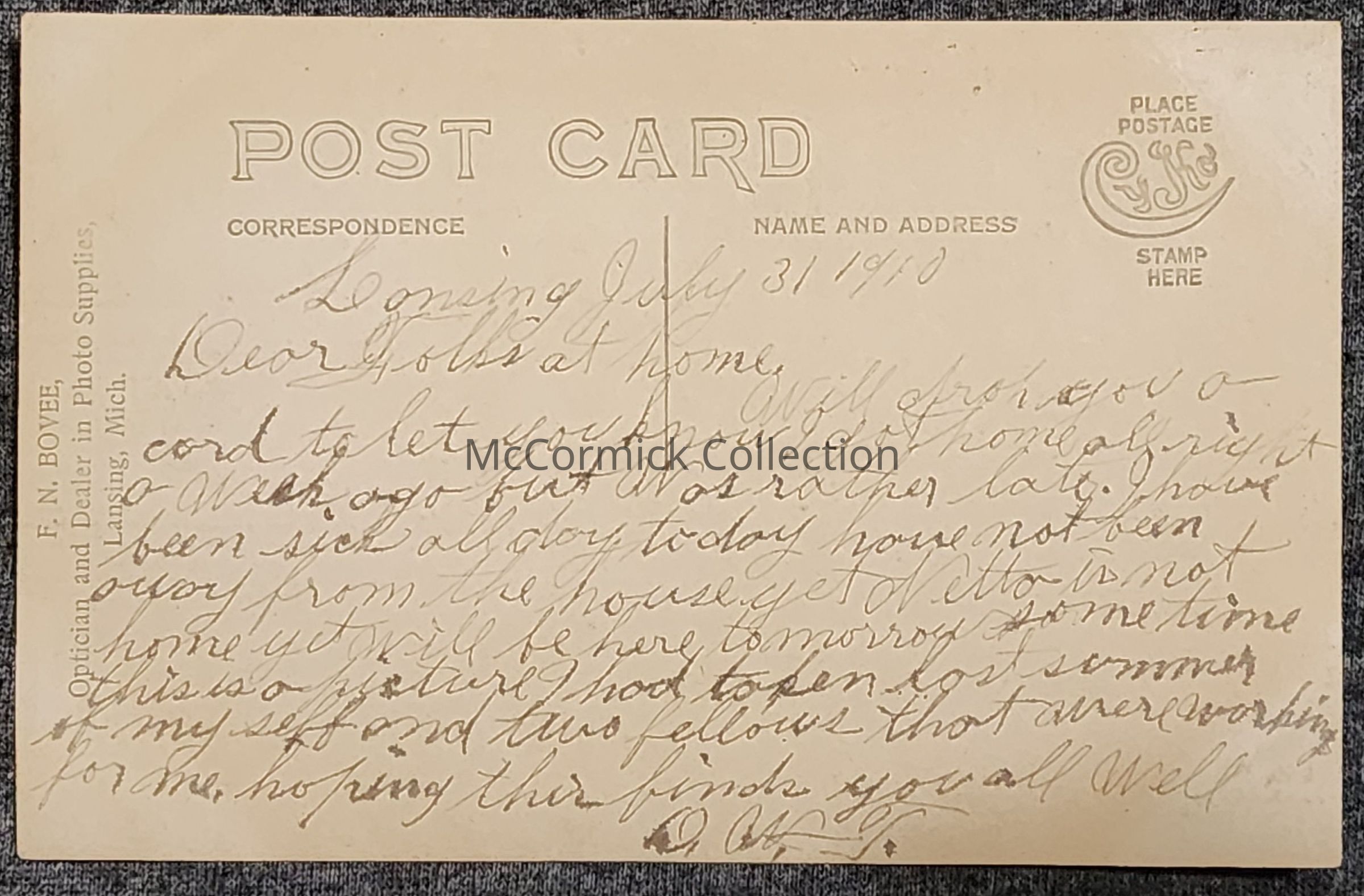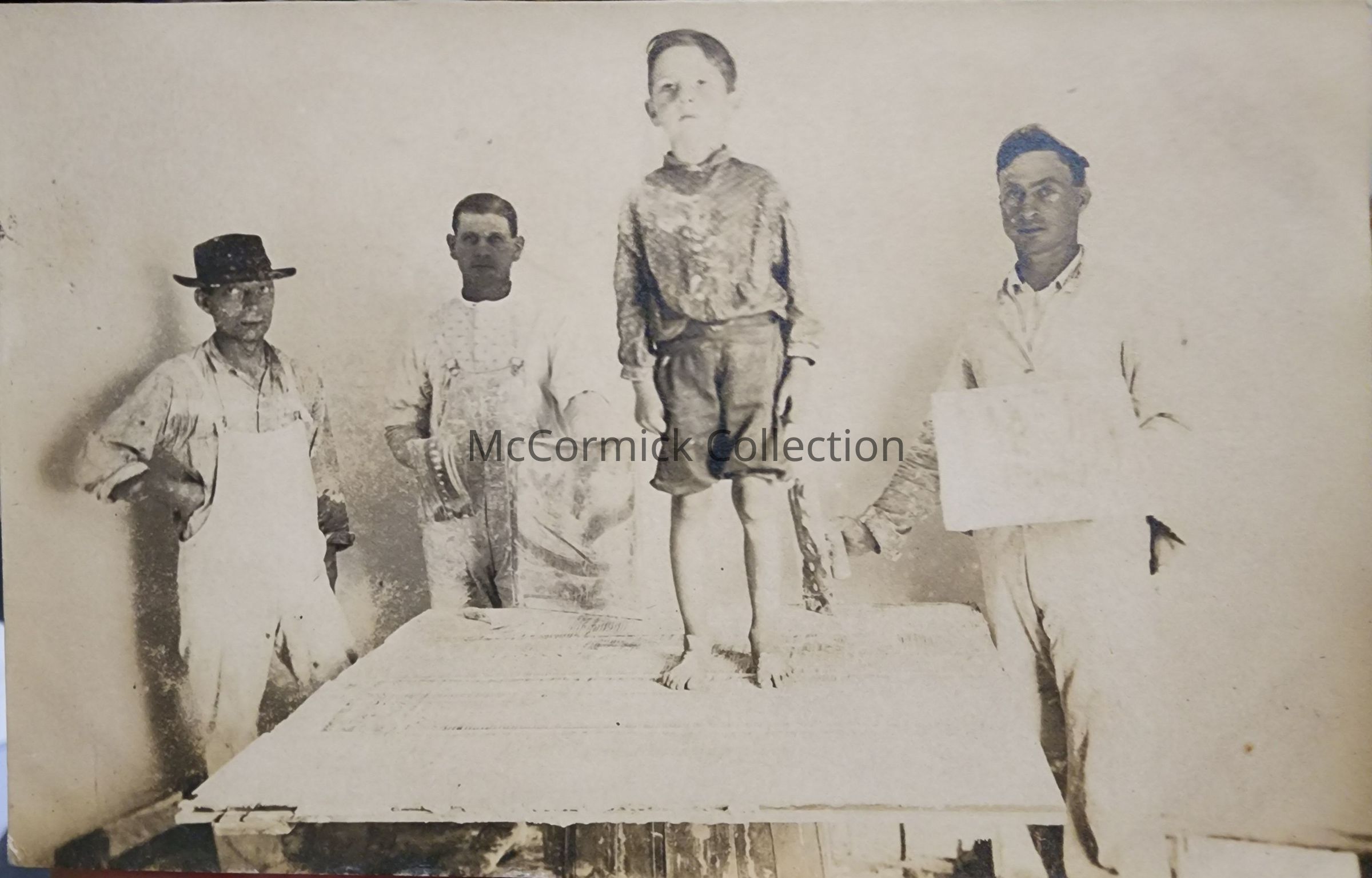 Real photo postcard of three men standing around a table with a young boy standing on the table. There appears to be plaster casts being made. Photo by Lansing photographer Bovee. Long writing on the back which identifies one of the men as DWF and the other two men as his employees, no other details as to the context. Cyko stamp box. Dated July 1910, photo taken Summer 1909.