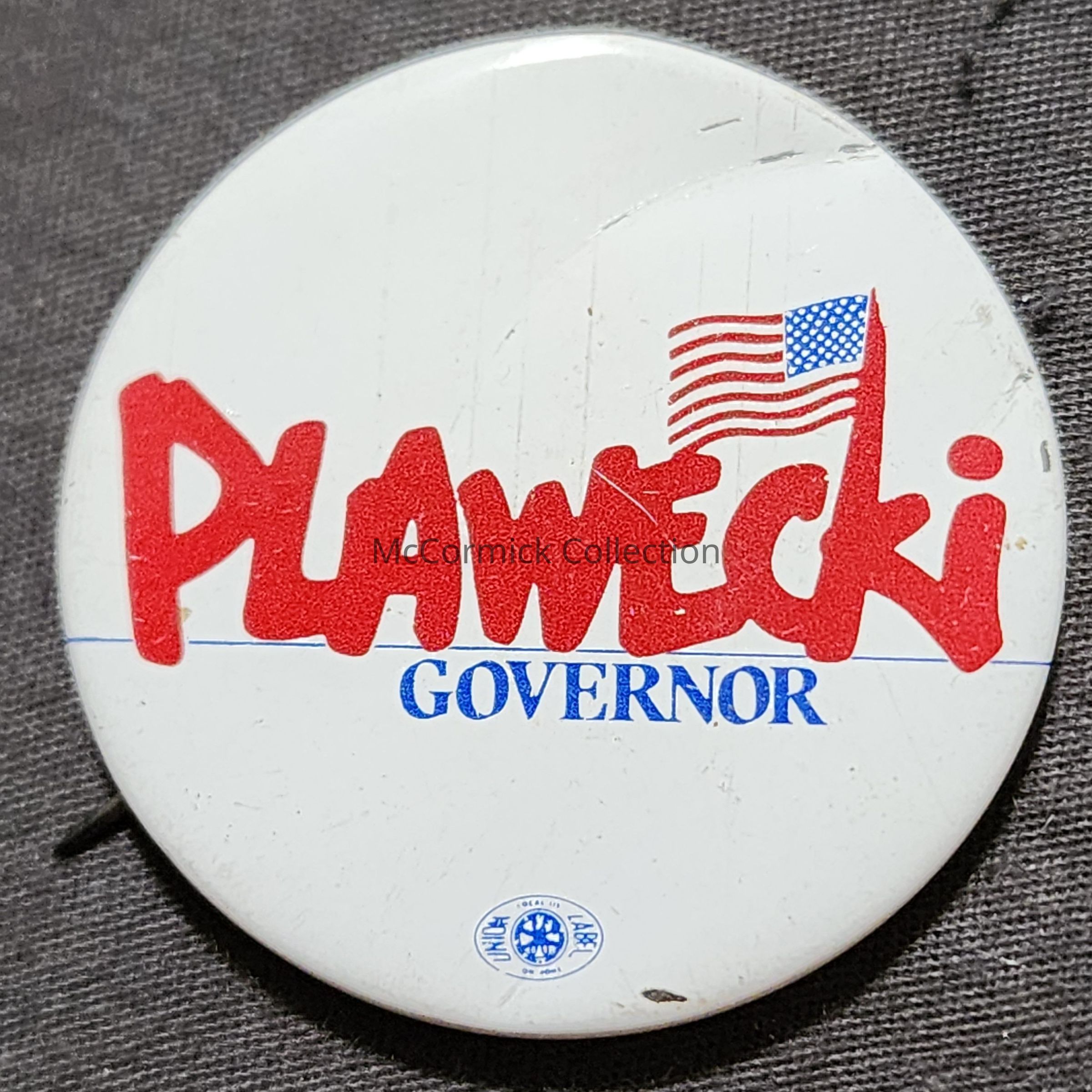 A 1.5" litho political button for Plawecki for Governor, circa 1980s.