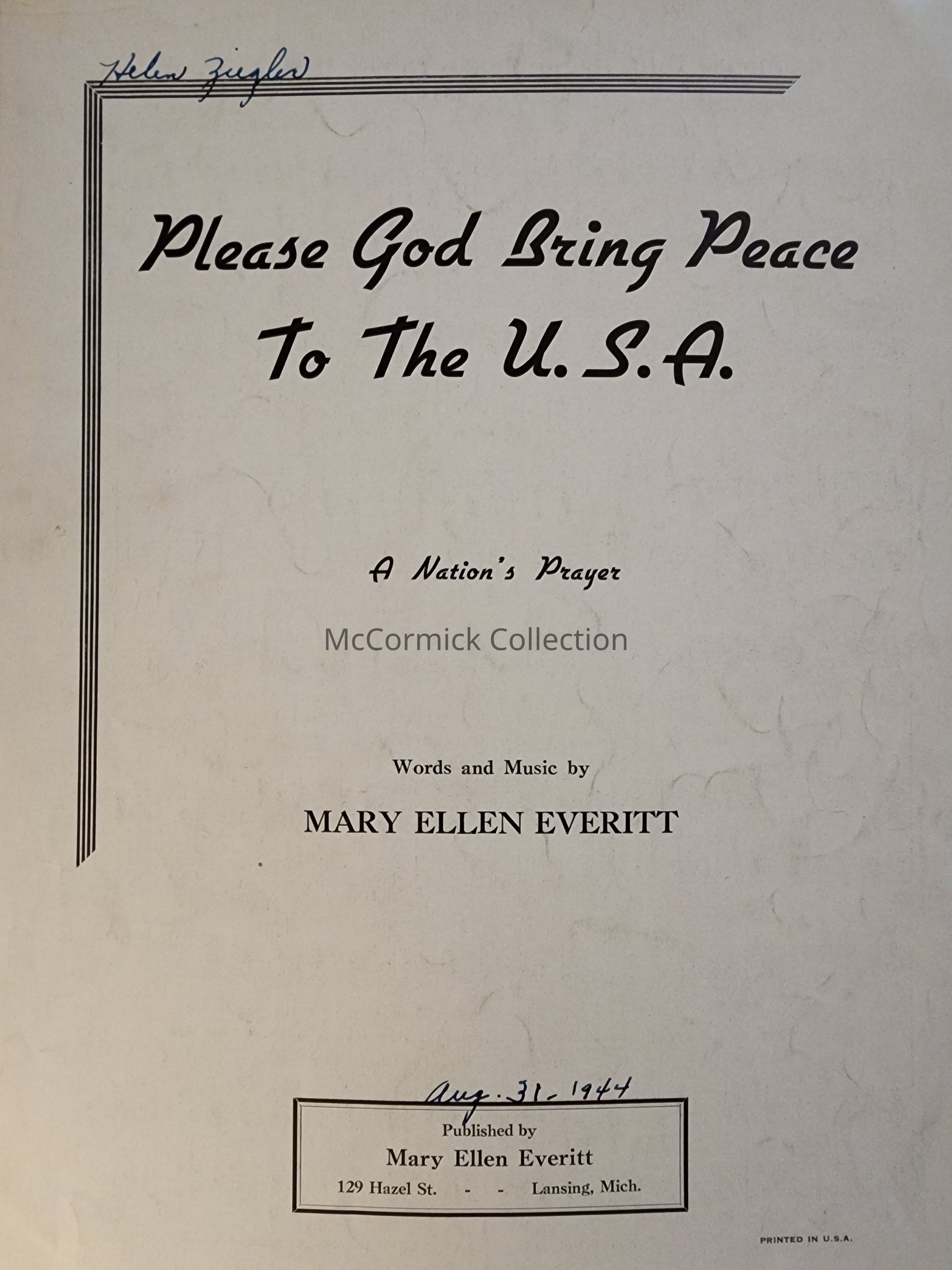 Words and Music by Mary Ellen Everitt. Published by Mary Ellen Everitt, 129 Hazel St., Lansing, Mich. Copyright 1942. Copy owned by Helen Ziegler.