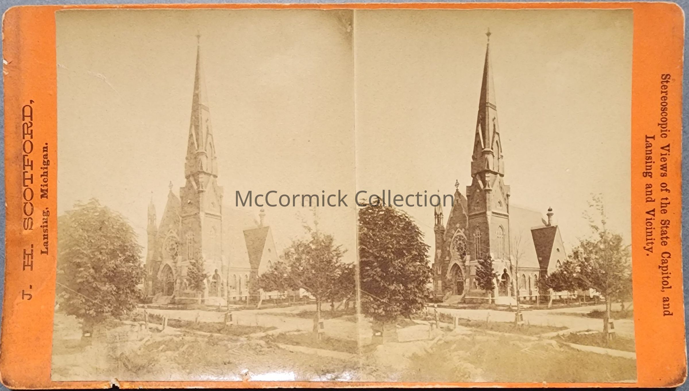 Stereograph of Plymouth Congregational Church at Allegan and Townsend Streets in Lansing by Lansing photographer John Harvey Scotford. Circa 1878.Made/Created