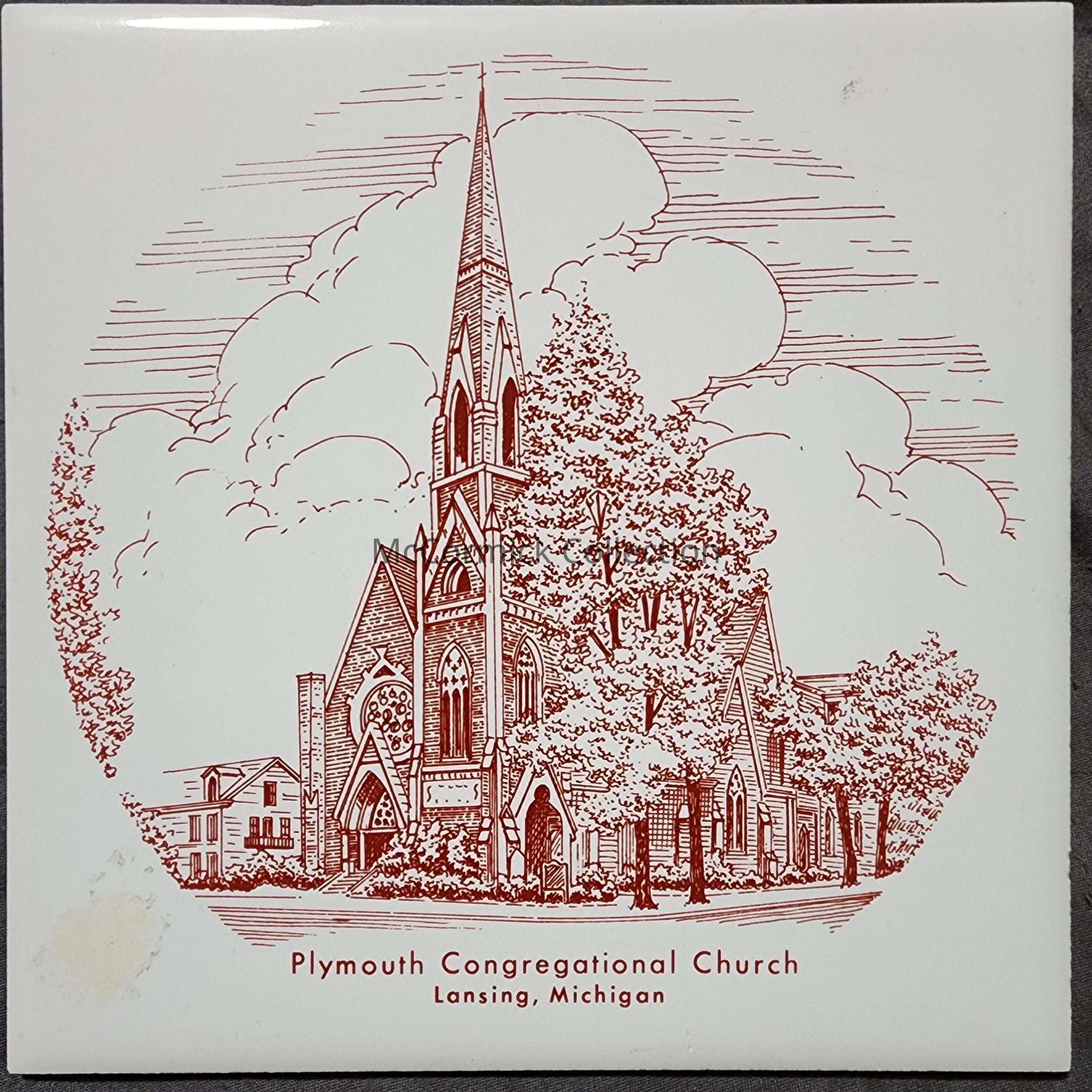 A 6" square souvenir tile of Plymouth Congregational Church in Lansing, Michigan.
