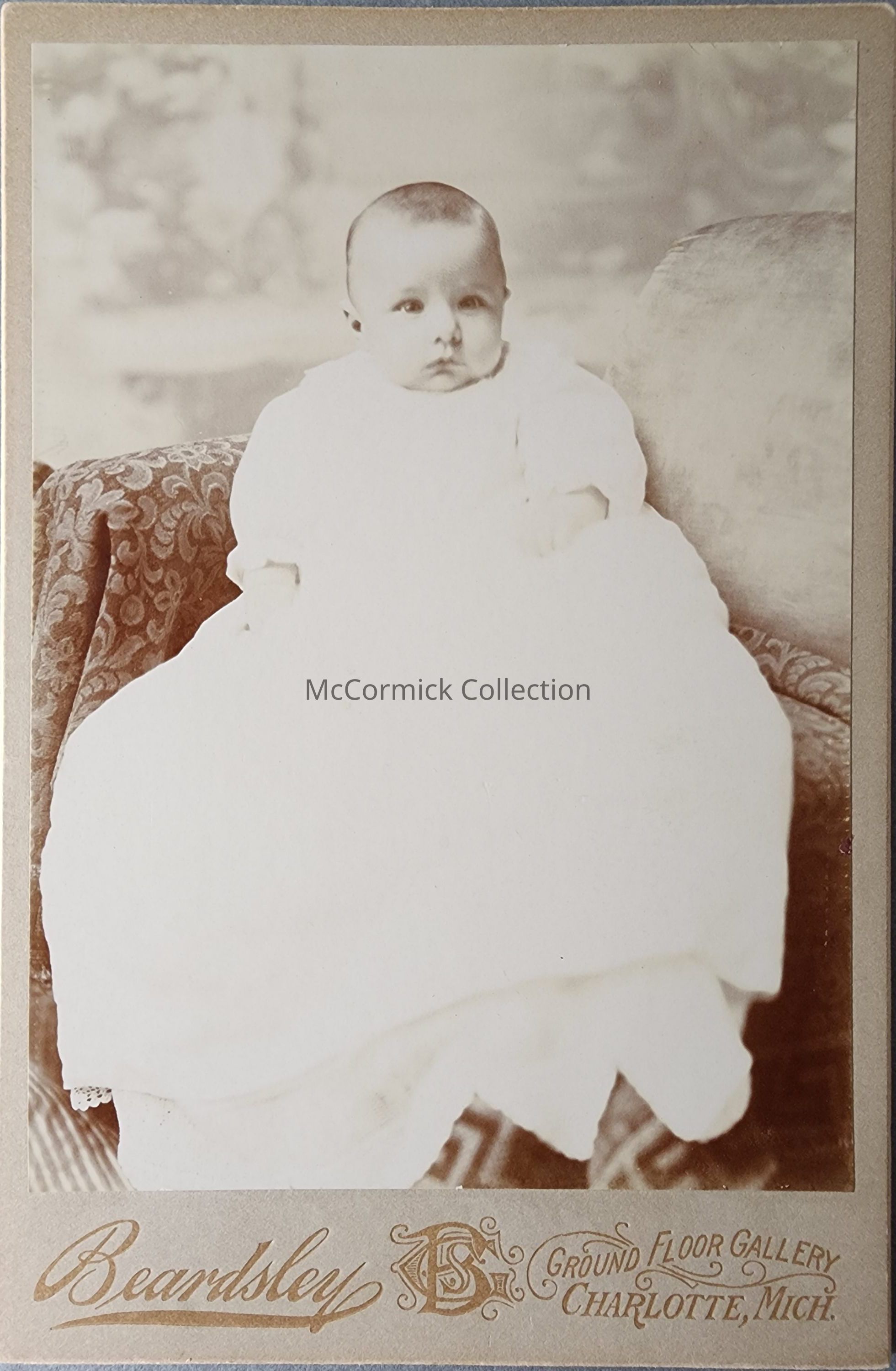 Cabinet card photograph of an unidentified baby by Beardsley of Charlotte. Beardsley also worked in Lansing.
