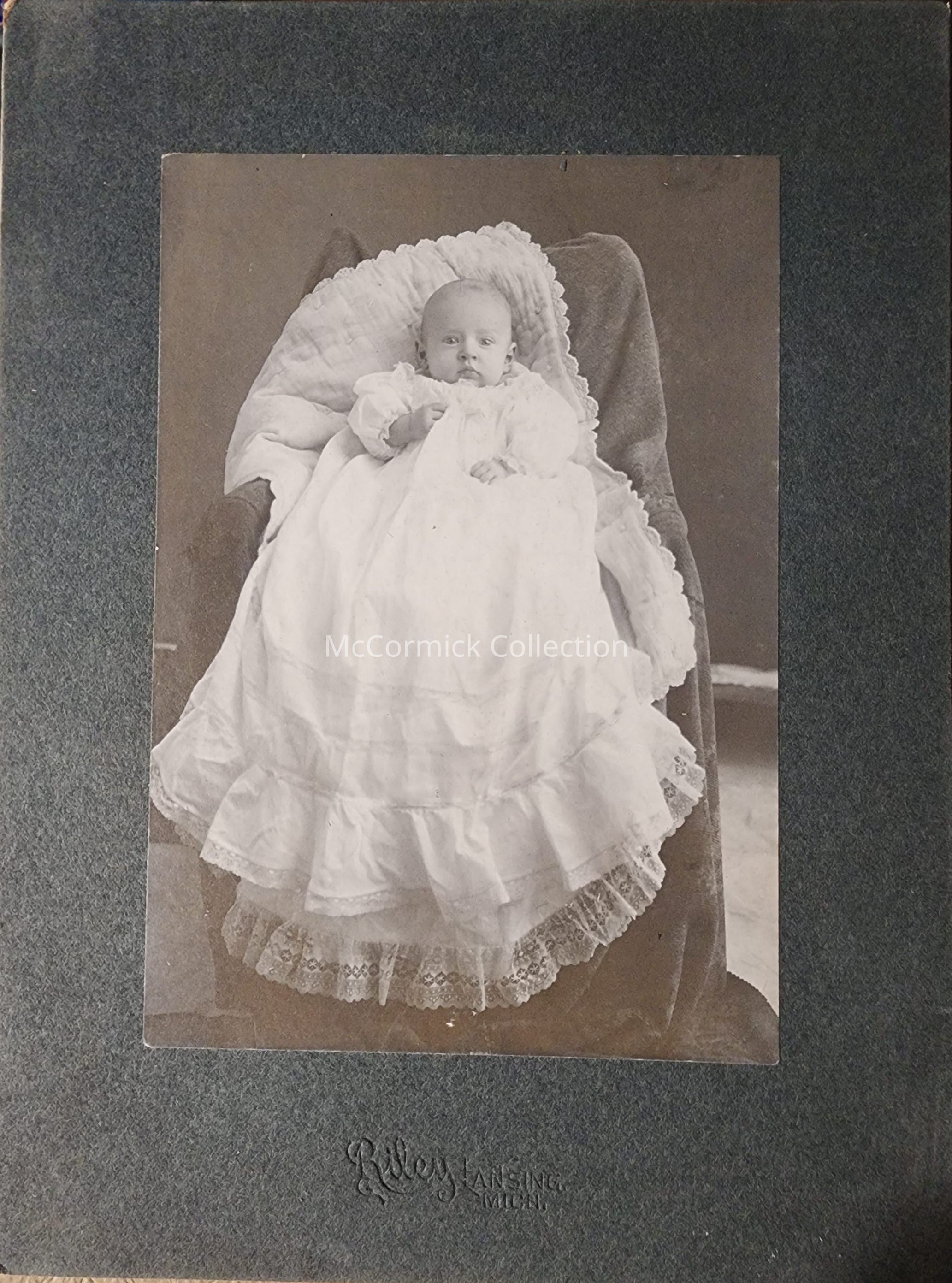Card mounted photograph of an unidentified baby by Lansing photographer S.S. Riley. From Siebert Estate.
