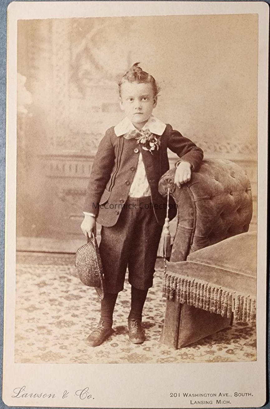 Cabinet card photograph of an unidentified boy by Lansing photographer Lawson, circa 1890s.