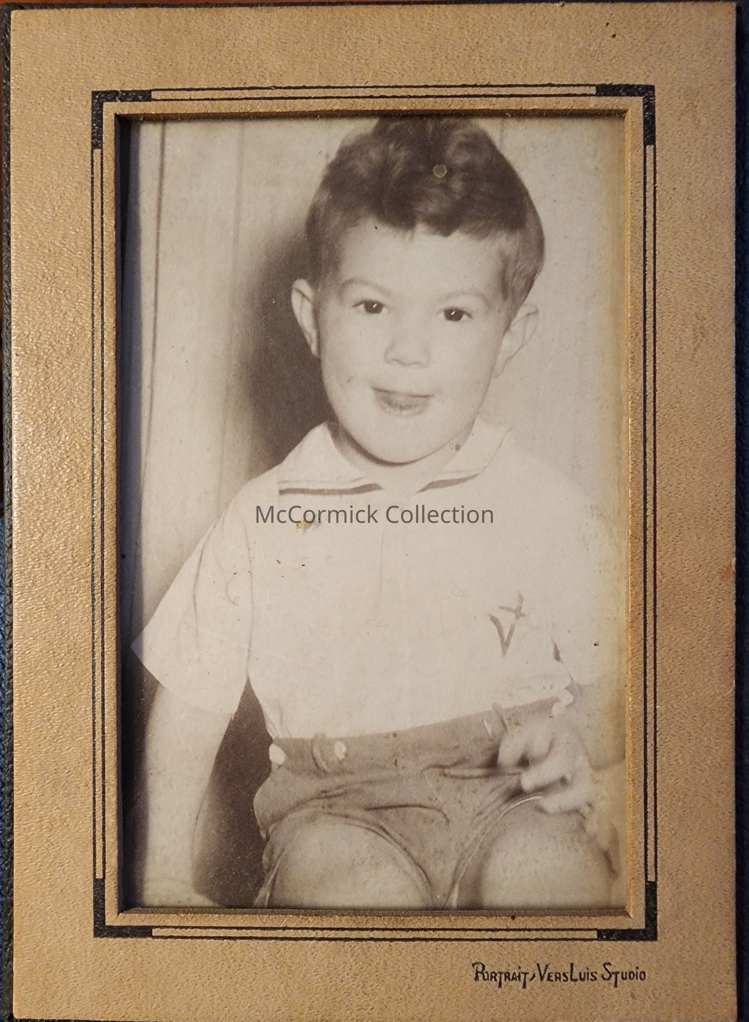 Frame mounted photograph of an unidentified child by Detroit photographer Gereene. Photo in a frame mount from Lansing photographer Versluis. The back of the photo includes a note from the photographer apologizing for the tongue in the photo.
