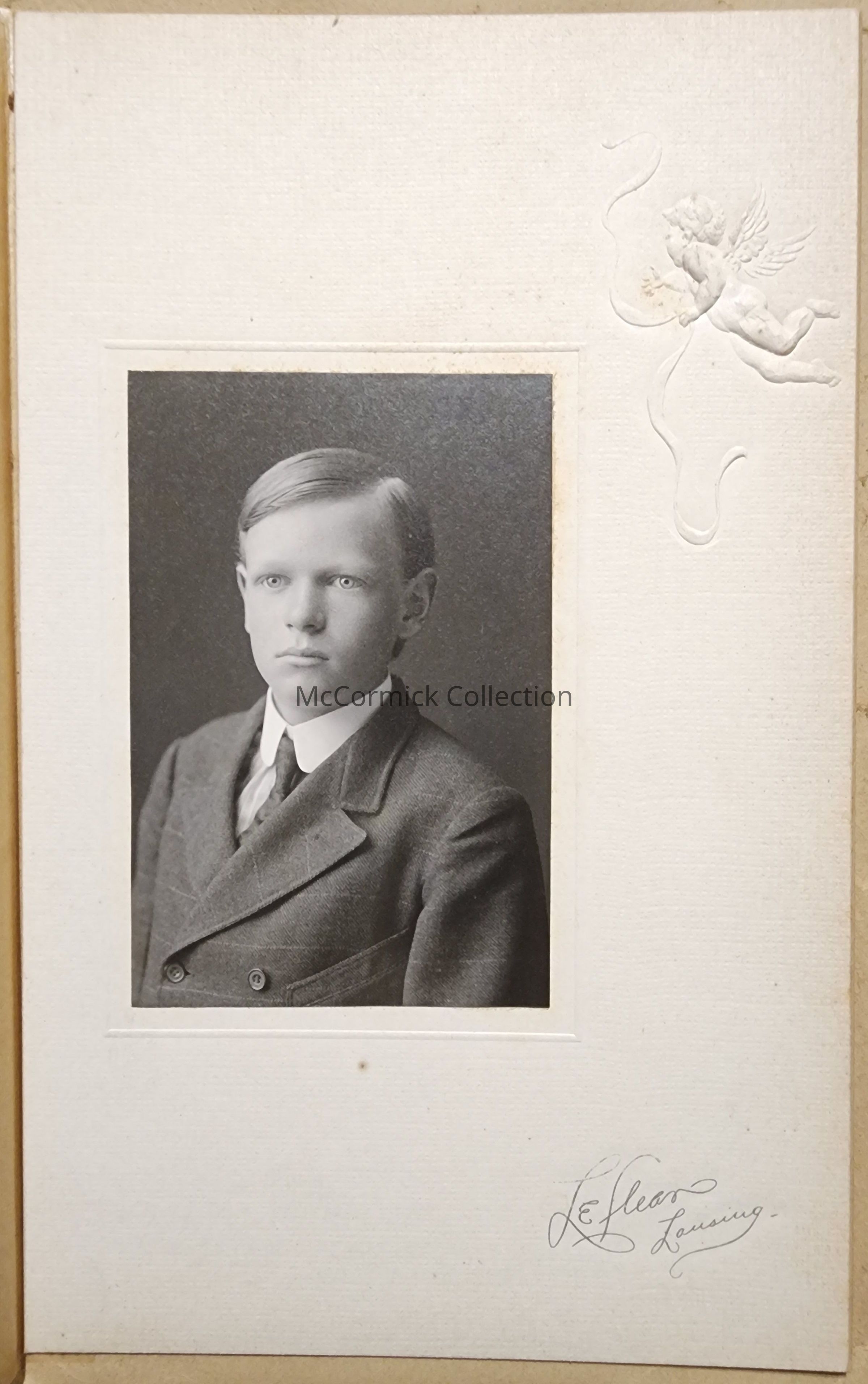 Folder frame mounted photograph of an unidentified child by Lansing photographer LeClear. Cherub mounting. From Severance family collection.