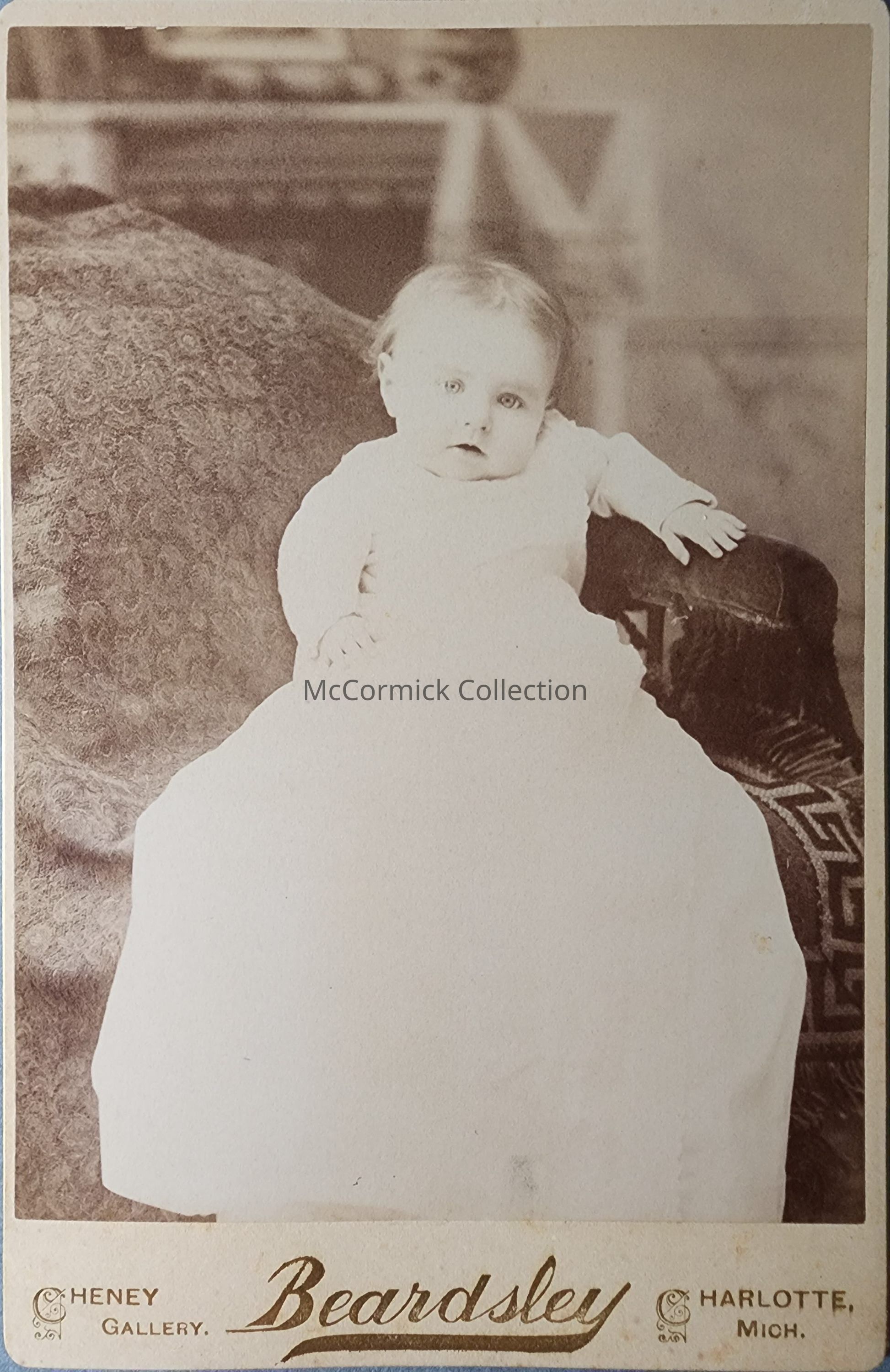 Cabinet card photograph of an unidentified baby by Beardsley of Charlotte, in the Cheney Gallery. Both Beardsley and Cheney worked in Lansing.