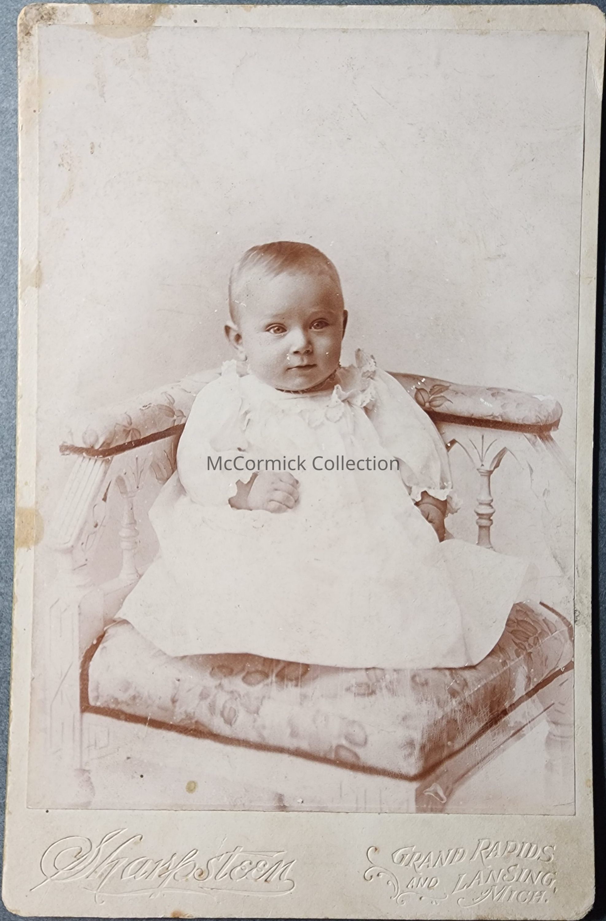 Cabinet card photograph of an unidentified child by Lansing photographer Sharpsteen.