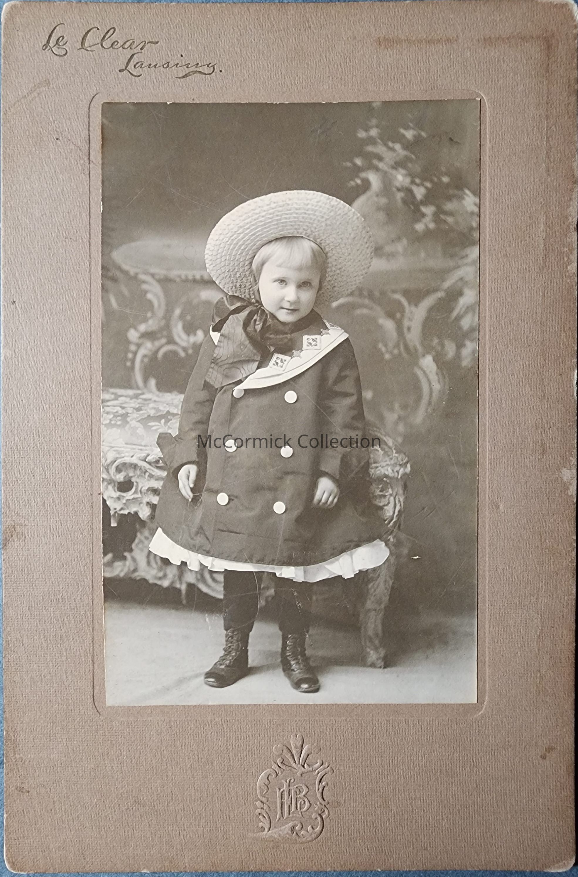 Card mounted photograph of an unidentified child by Lansing photographer LeClear, circa 1900s.