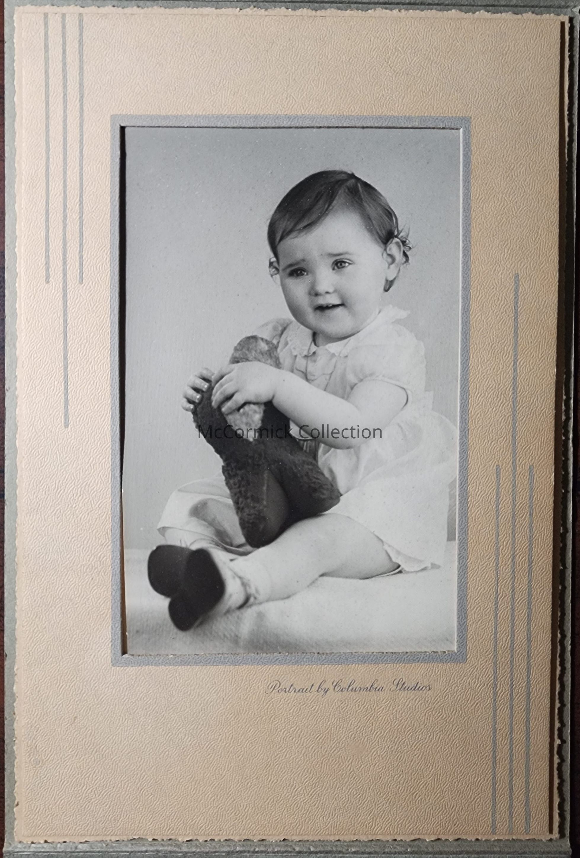 Portrait of an unidentified child with stuffed animal by Lansing photographer Columbia.