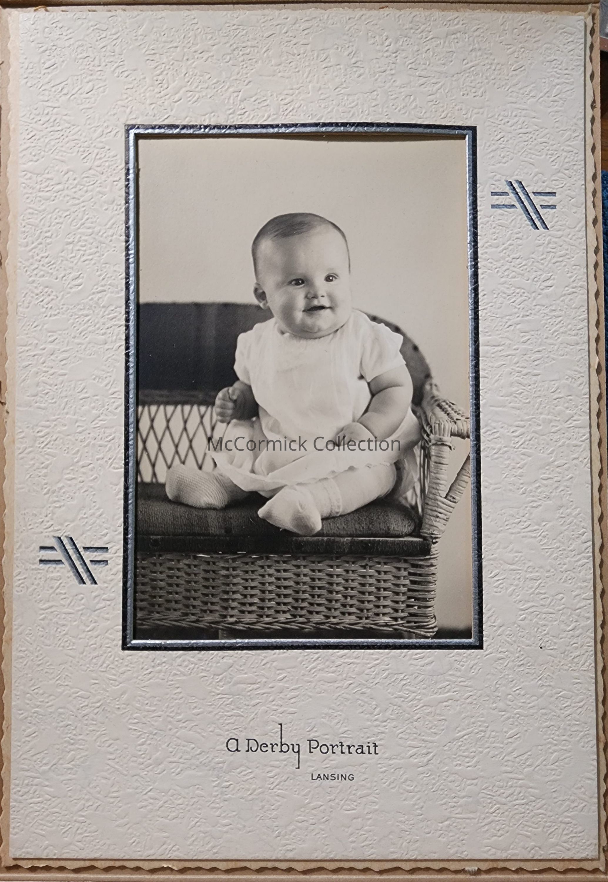 Portrait photograph of an unidentified baby by Lansing photographer Derby. Mounted in paper cardboard frame/folder. From Siebert Estate.