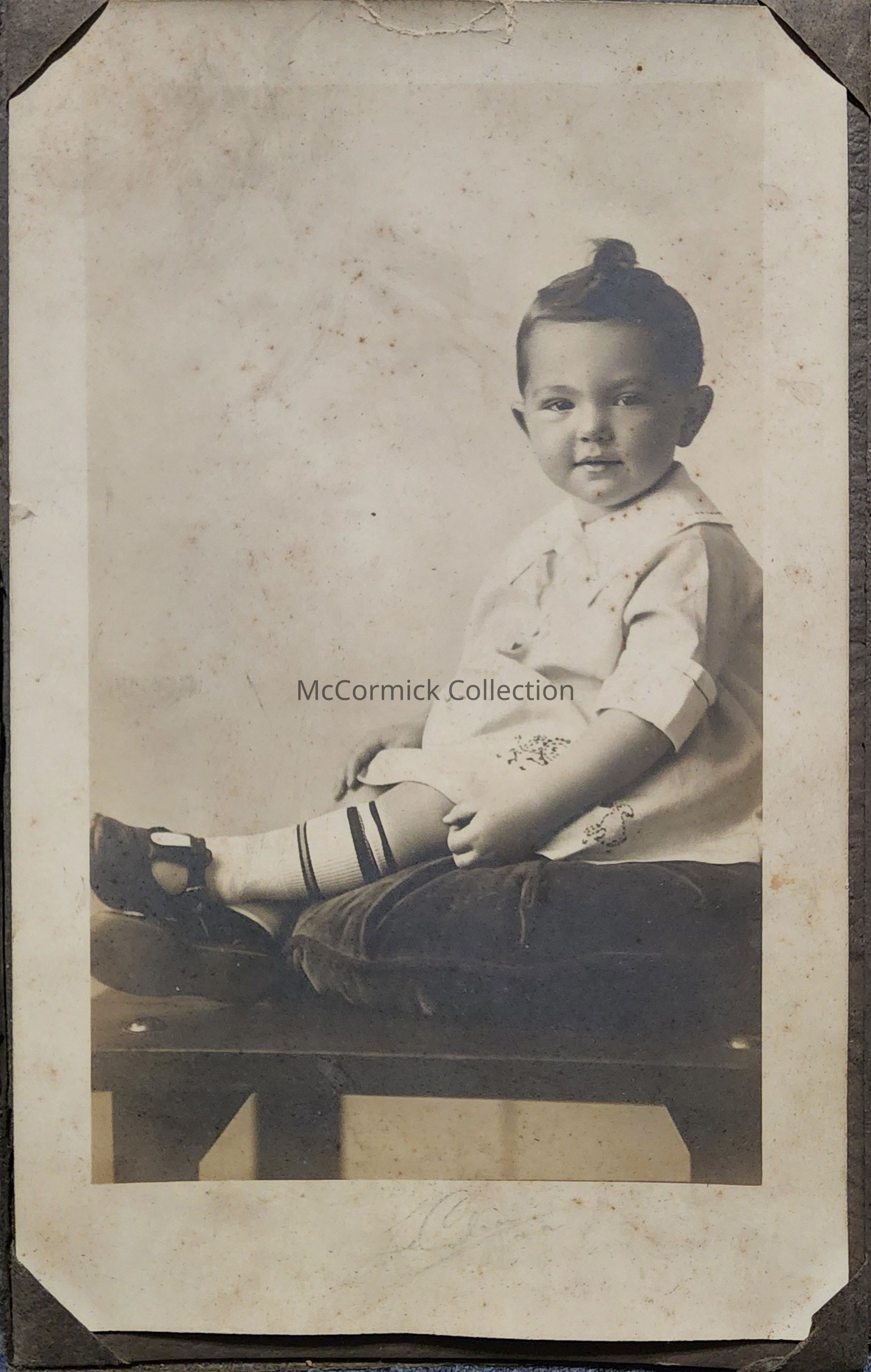 Folder frame mounted photograph of Bob Lorenz, age 2, by Lansing photographer LeClear. Dated c. 1922.