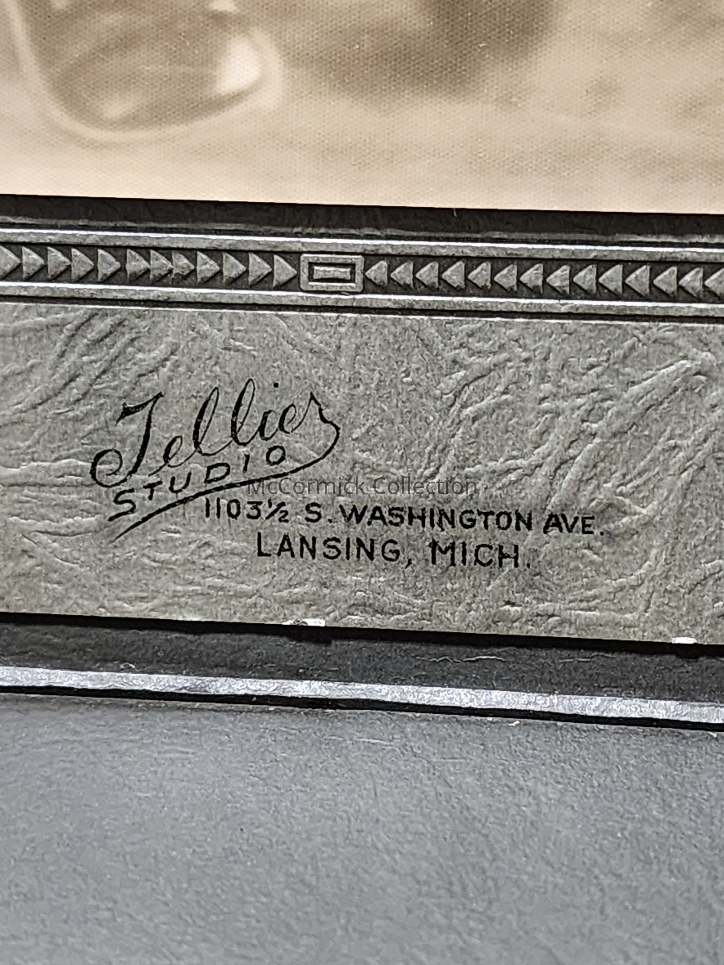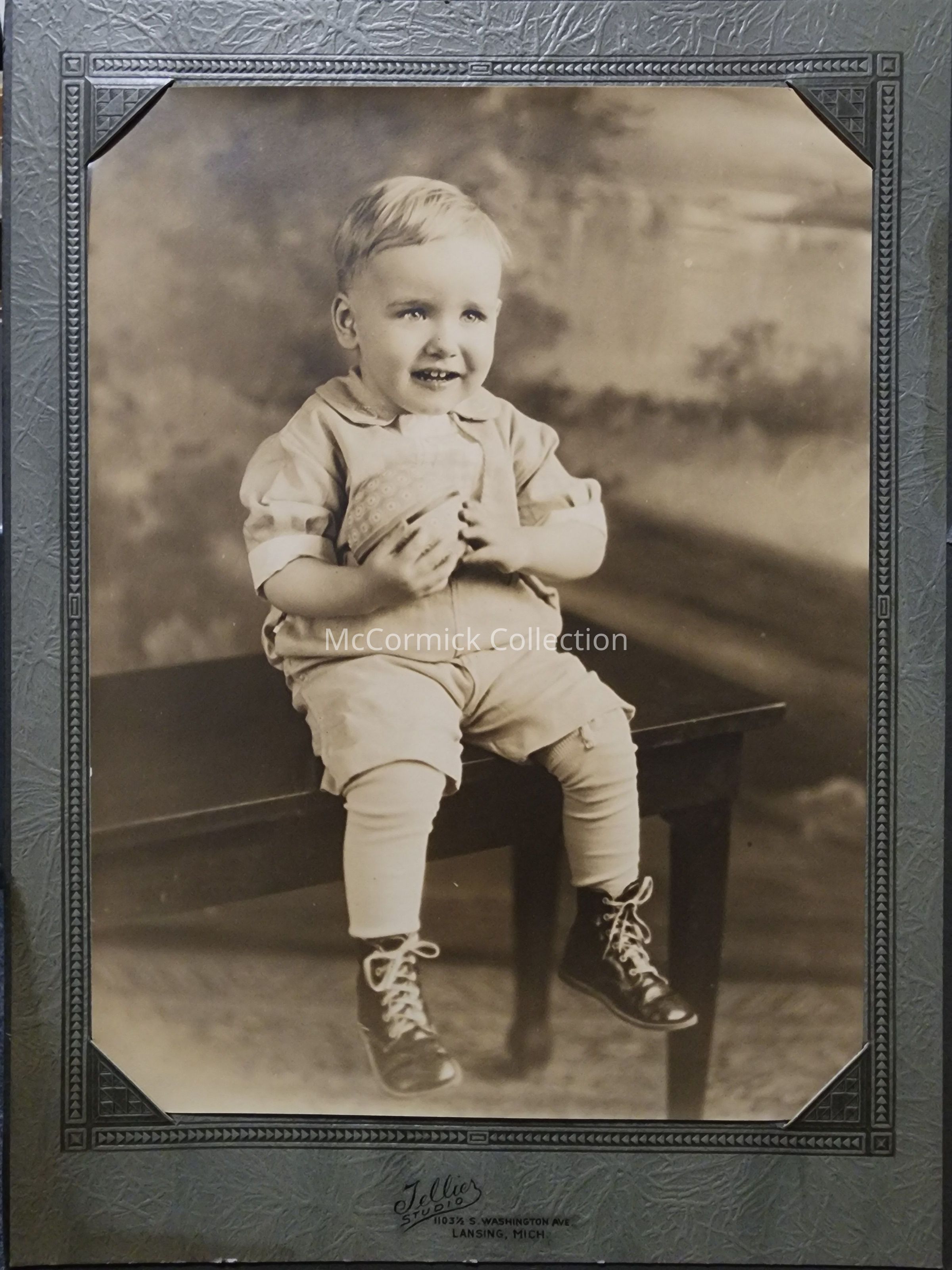 Folder frame mounted photograph of an unidentified child by Lansing photographer Tellier Studio.