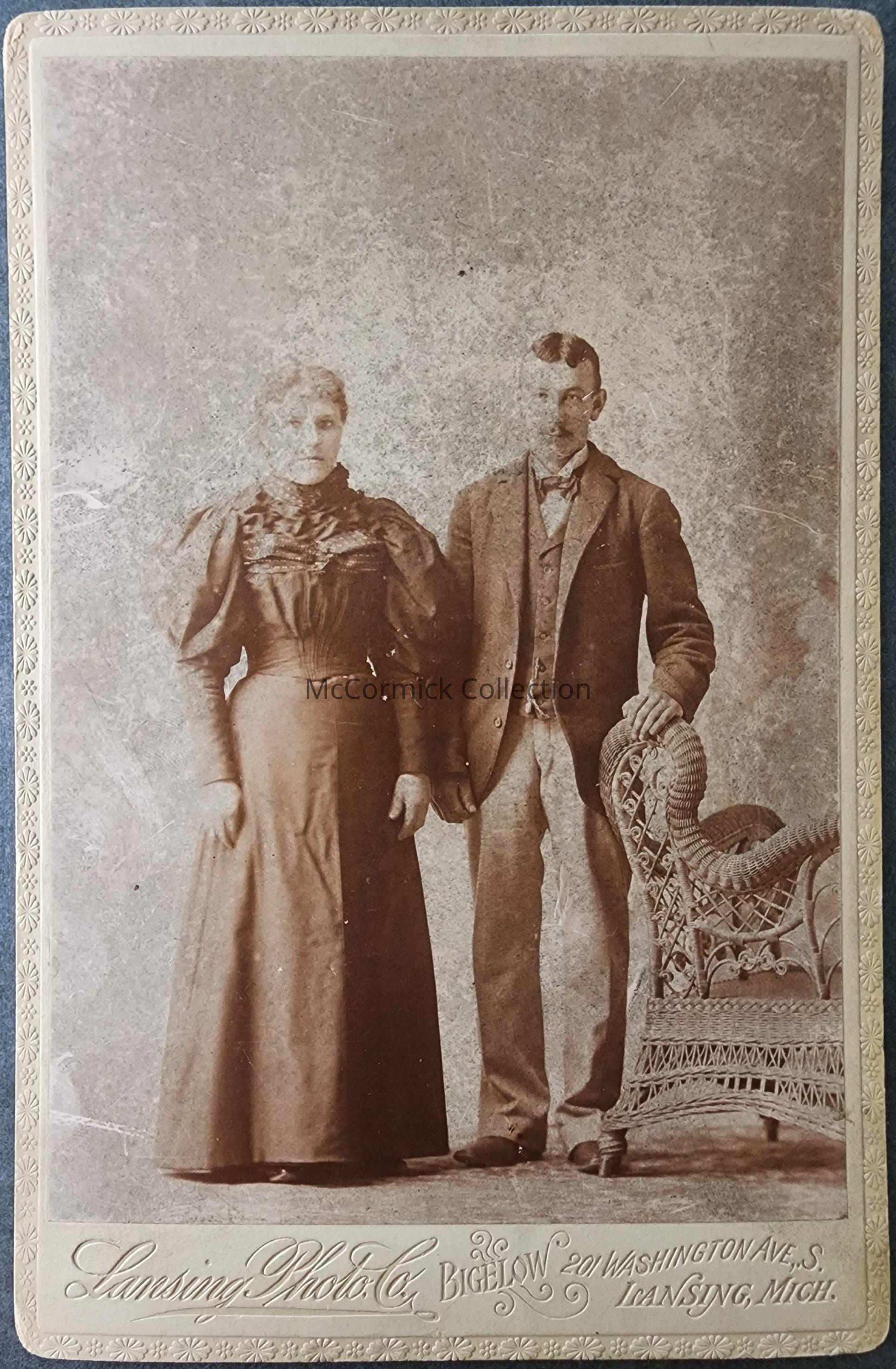 Cabinet card photograph of an unidentified couple by Lansing photographer Bigelow, circa 1893-95.