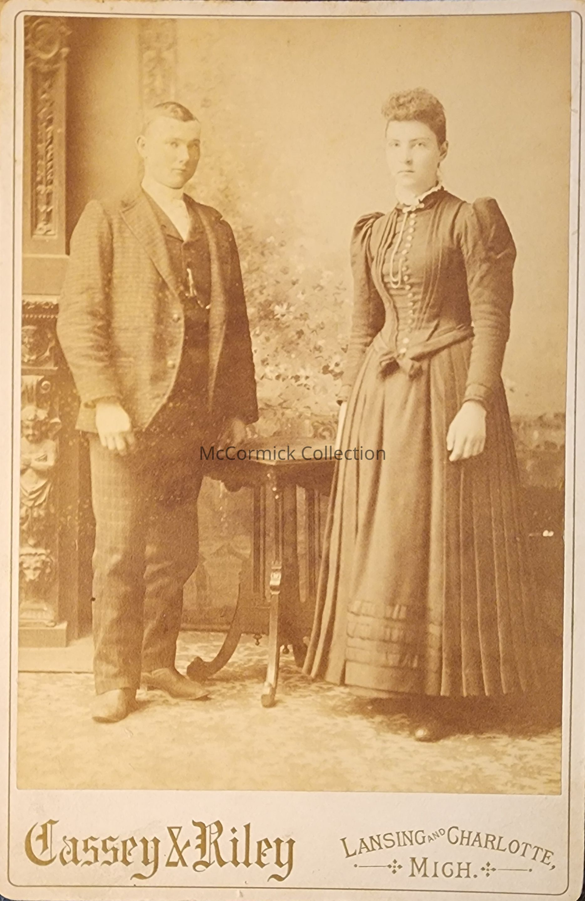 Cabinet card photograph of an unidentified man and woman by Lansing photographer Cassey and Riley.