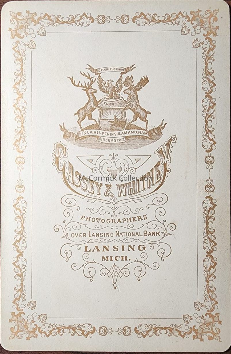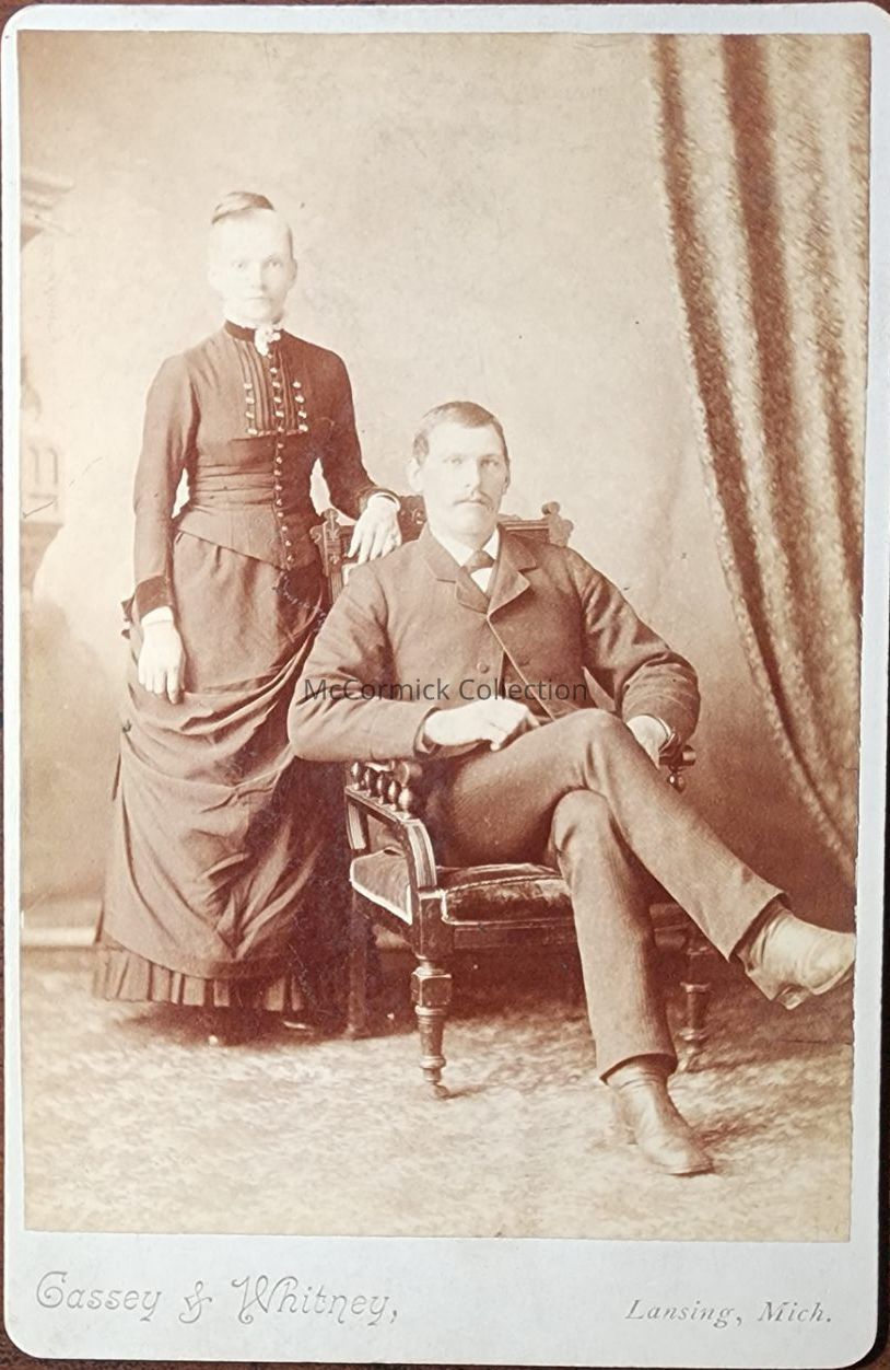 Cabinet card photograph of an unidentified couple by Lansing photographer Cassey and Whitney.