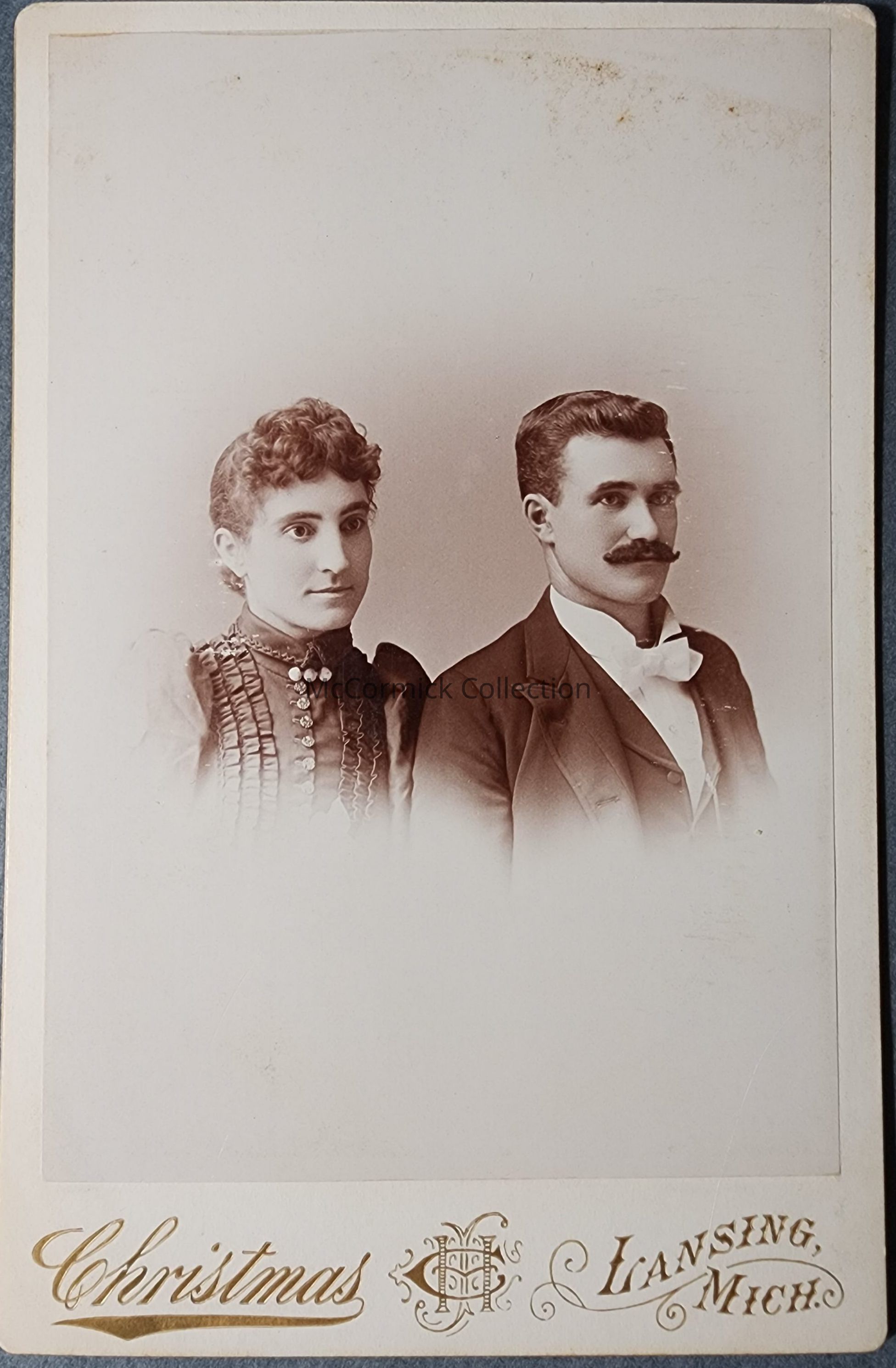 Cabinet card photograph of an unknown couple taken by Lansing photographer Christmas, circa 1890s.