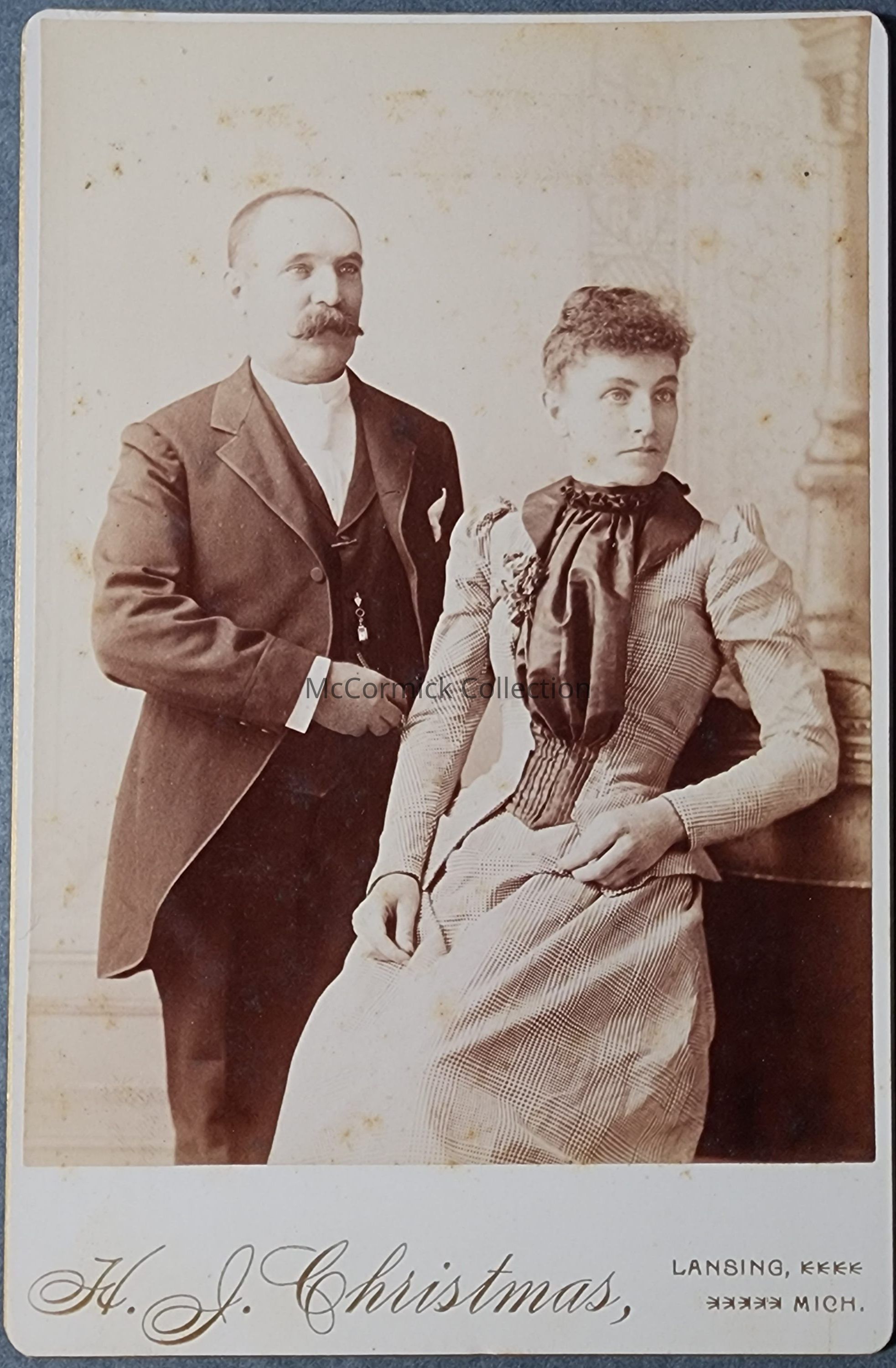 Cabinet card photograph of an unidentified couple by Lansing photographer Christmas, circa 1890s.