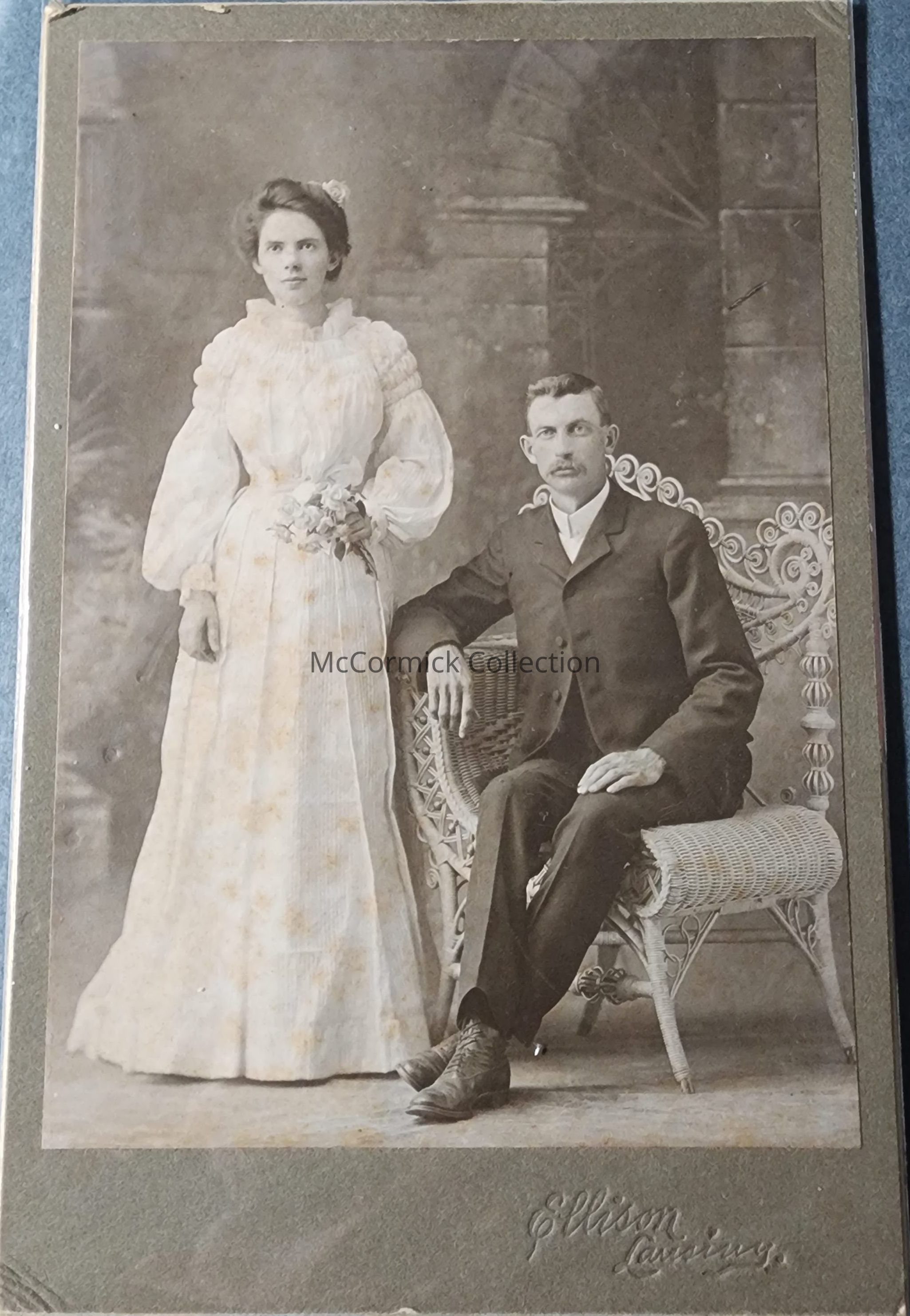 Cabinet card photograph of an unidentified couple by Lansing photographer Ellison, circa 1890s.
