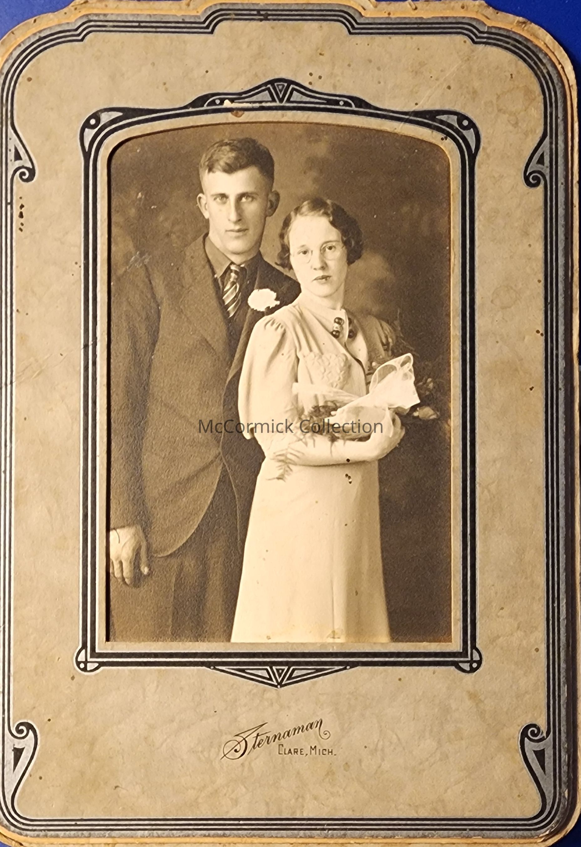 Folder frame mounted photograph of an unidentified man and woman by Clare photographer Sternaman.