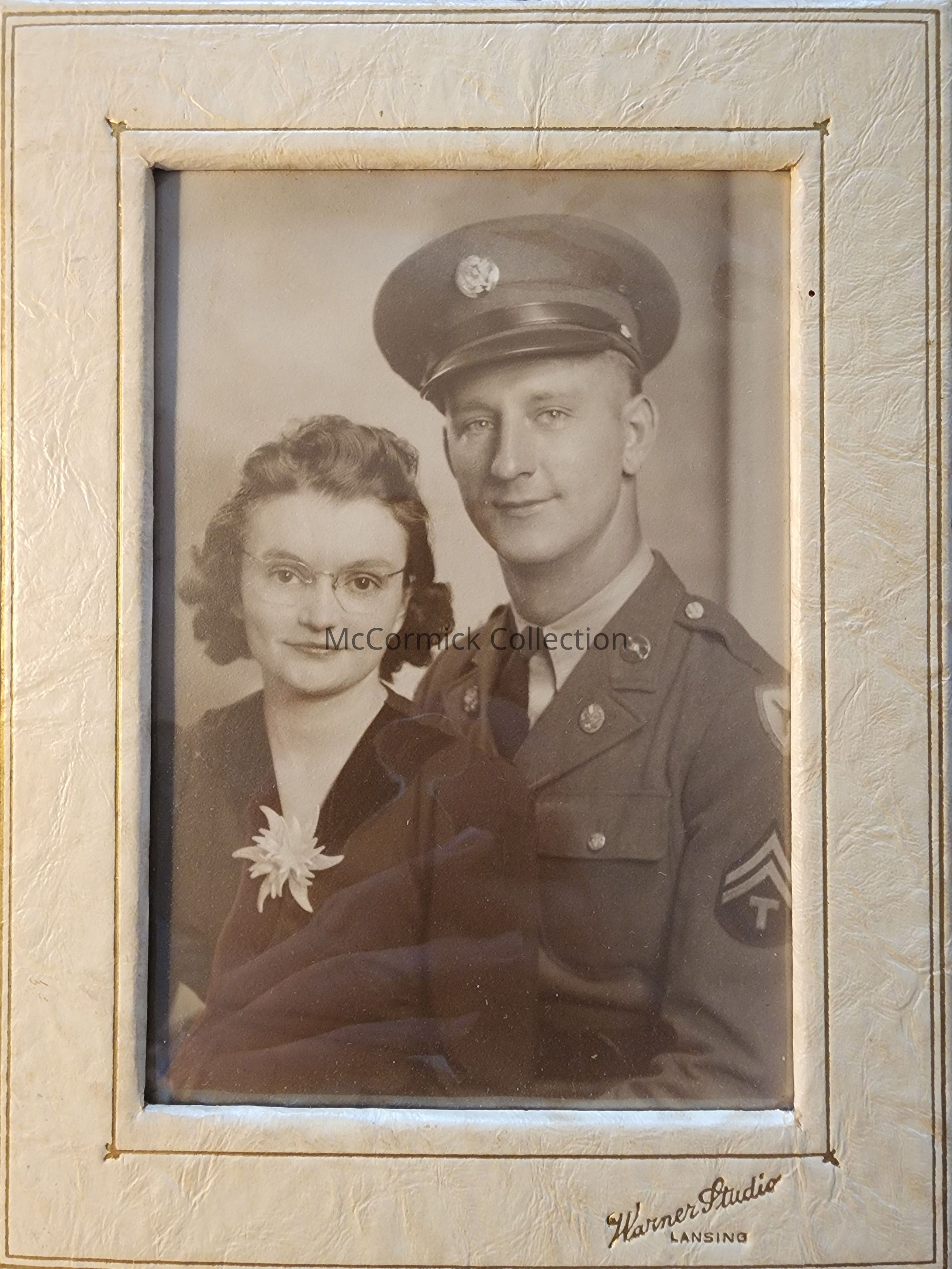 Frame mounted photograph of an unidentified couple by Lansing photographer Warner Studio. Man is pictured in a military uniform.