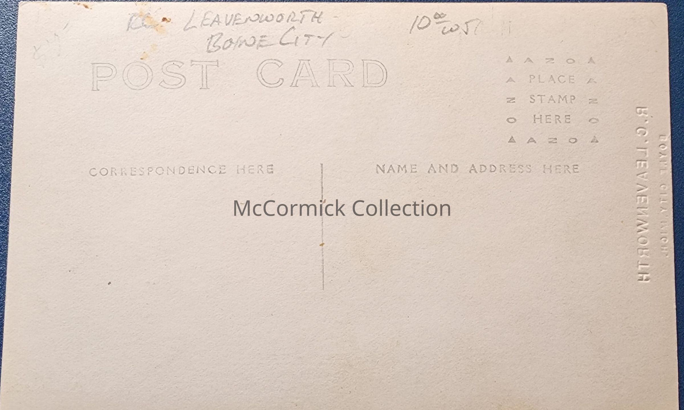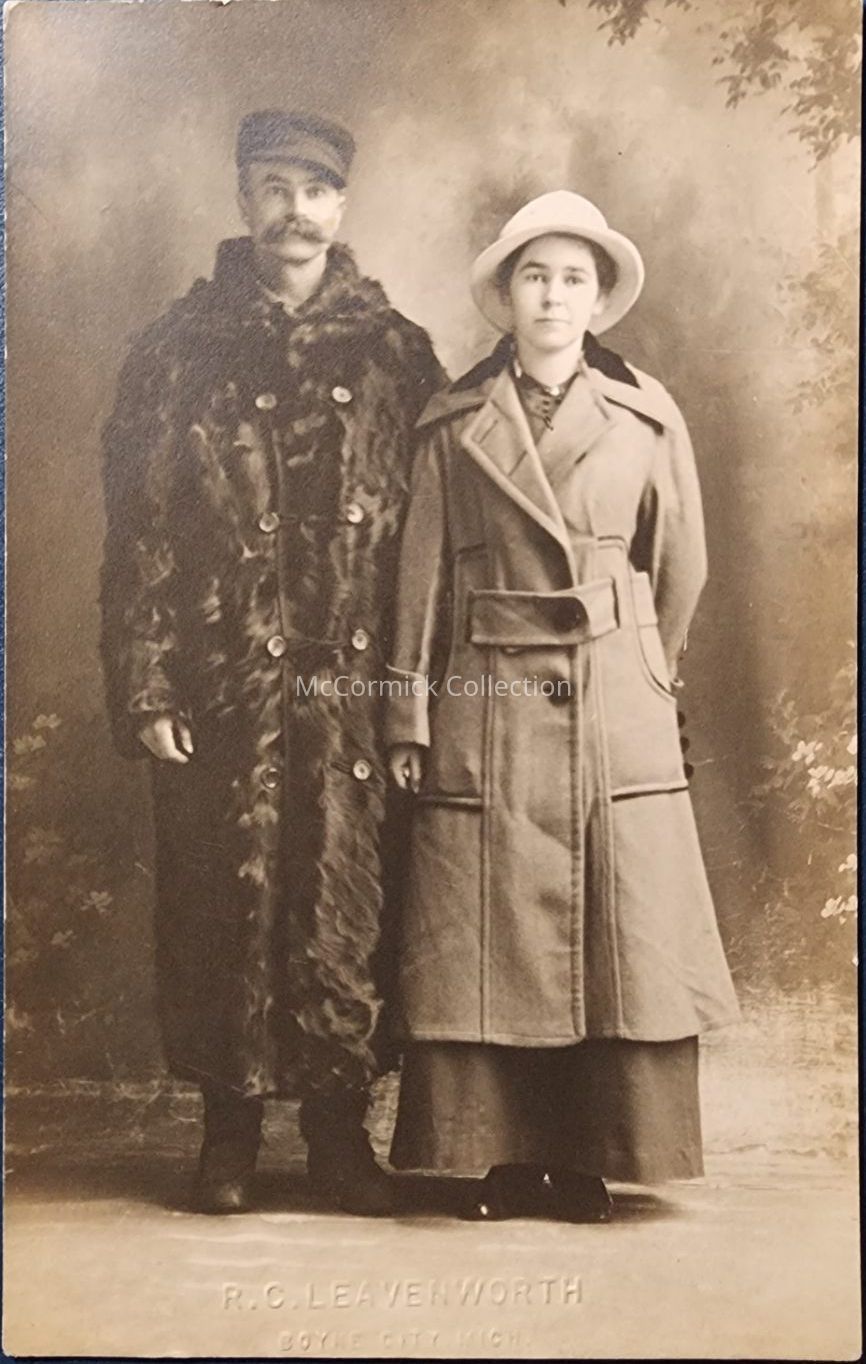 Real photo postcard of a couple wearing large fur coats taken by R.C. Leavenworth of Boyne City, Michigan. Studio blind stamp at the bottom.