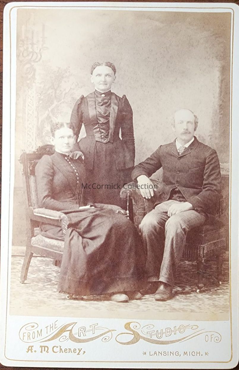 Cabinet card photograph of an unidentified family of three by Lansing photographer Cheney.