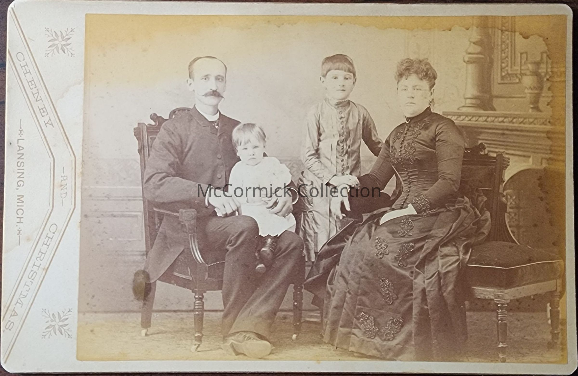 Cabinet card photograph of an unidentified family by Lansing photographer Cheney and Christmas.