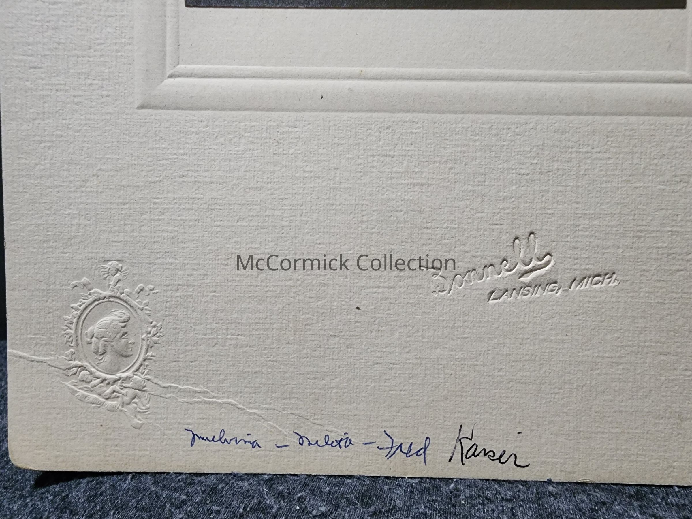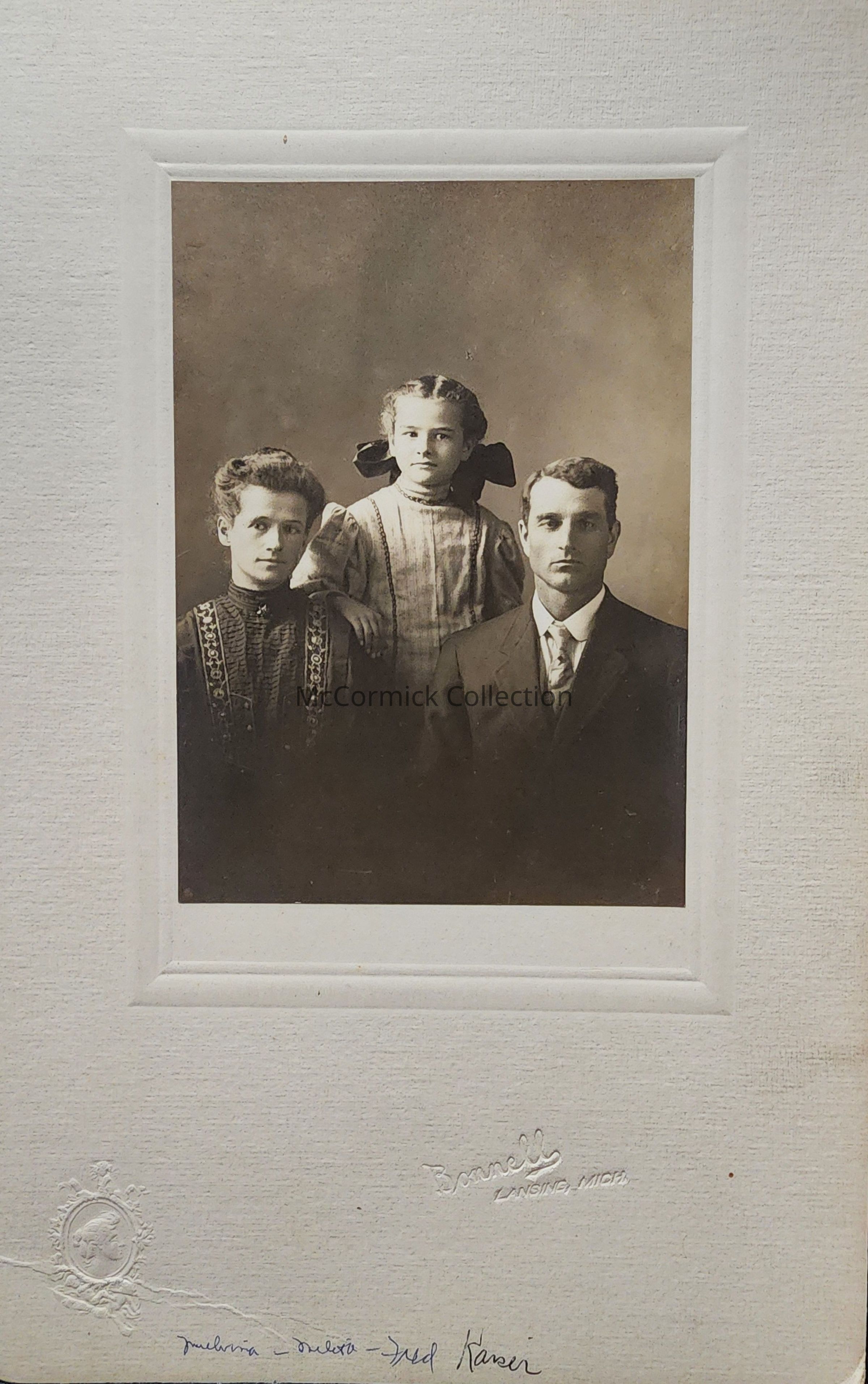 Card mounted photograph of an identified family, Melvina and Fred Kasir or Kaiser or Karsei, by Lansing photographer Bonnell.